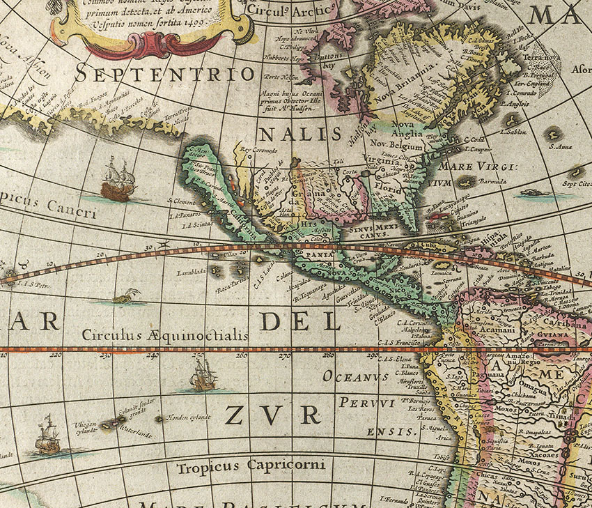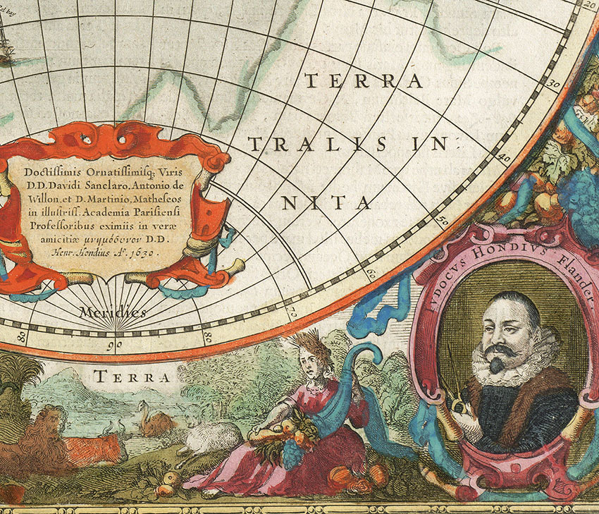 オランダにおける、地図製作の黄金時代に好まれたバロック調のデザインになっています。 紀元前にバビロニア人たちが最古の世界地図を描いてから、数多くの世界地図がこの世に生まれてきました。 |