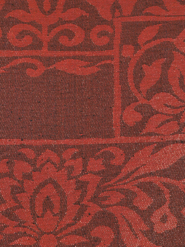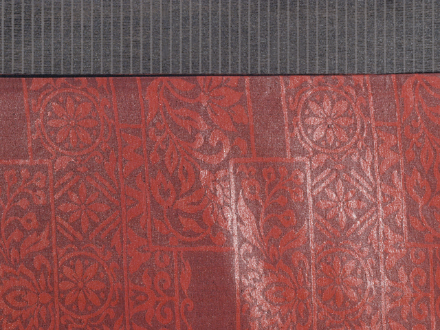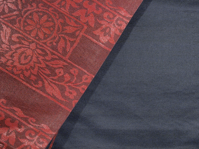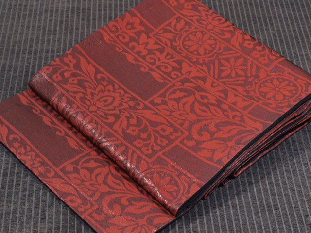 全体的な印象としては、深く沈んだ赤墨色の地に、漆箔で更紗調の唐花草の配された角の文様が織り込まれている、西陣織の京袋帯です。名古屋帯と同様にお使いいただけます。 シンプルですが、深く沈んだ赤茶色系の文様がオリエンタルな趣を醸していて、品の良い雰囲気です。帯芯が入れられていないお仕立てになっているので、軽めの帯がお好みの方におすすめです。白色系のお着物に合わせていただくと引き立ちそうです。 ユーズド品で、前の折り跡がごくうっすらとあるほか、箔糸にこまかな凹みや傷みがちらほらとありますが、気になるようなものはありません。そのほかに目につく大きなしみやよごれ、褪色などのダメージはなく、全体的にはきれいな状態です。 |