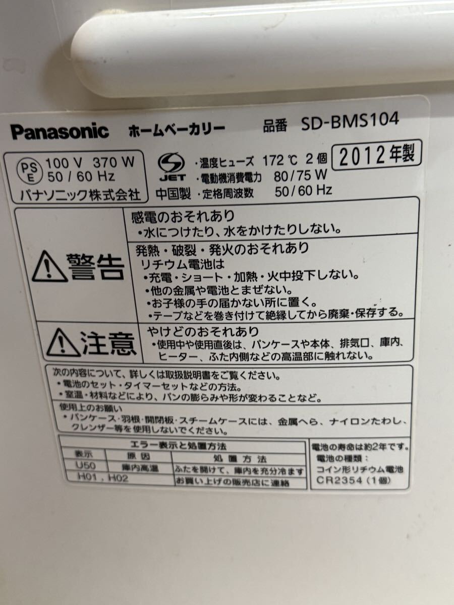 ②Panasonic ホームベーカリー SD-BMS104(2012年製)。レーズン自動投入対応モデル。ラベル表記:100V/370W/50-60Hz、電動機消費電力80/75W、温度ヒューズ172℃×2、中国製。