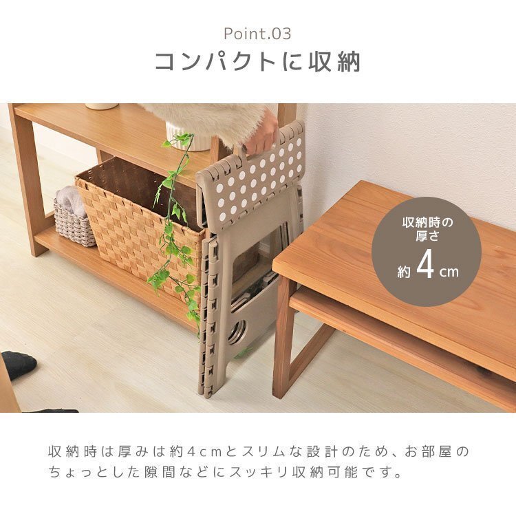 | \おうちに1台あると便利/ 組立簡単!踏み台や折りたたみの椅子として、人気のスツールです! 耐荷重は90kg!なので、大人の方が乗っても安心! 折りたたむとカバンのようなカタチになるので、持ち運びもラクラク。 こんな時にも大活躍! ・キッチンで高いところのものを取ったり ・玄関で靴をはくときにちょっと腰掛けたり ・野外に持ちだしてキャンプやスポーツ時の椅子としても 洗車をする時の踏み台として、車に常備しておくのも良いです! 可能性無限大!あなたの生活スタイルにあわせてスツールをご活用ください!! 【商品詳細】 カラー:グレージュ サイズ(約) ・使用時:幅39cm×奥行32cm×高さ39cm ・折りたたみ時:幅39cm×奥行4cm×高さ52cm 重量:(約)1.5kg 耐荷重:(約)90kg 素材:ポリプロピレン樹脂(PP)+EVA樹脂 ※入荷時期によって天板のすべり止めの色が写真と異なる場合がございます。すべり止めの色の指定は出来かねますのでご了承くださいませ。 |