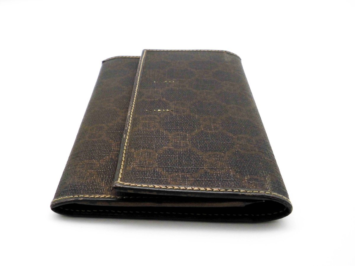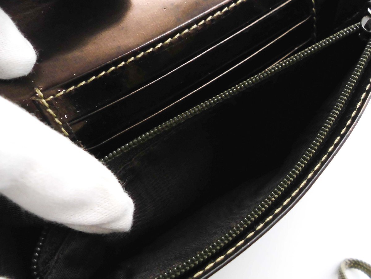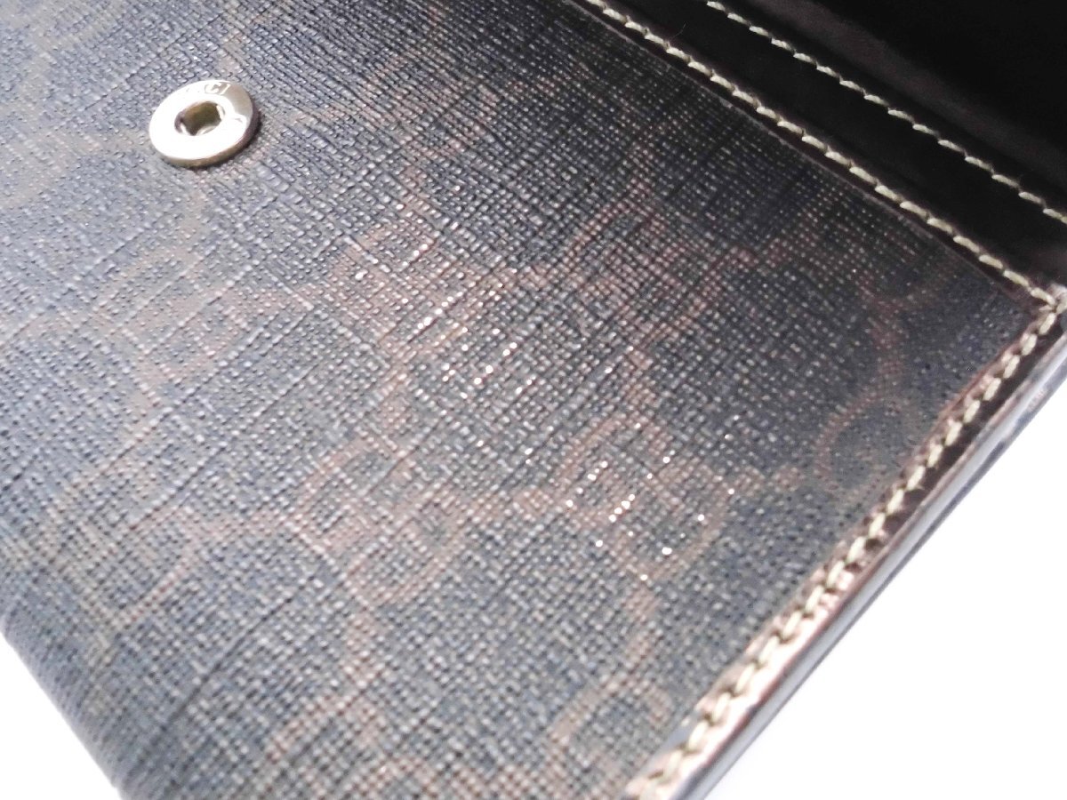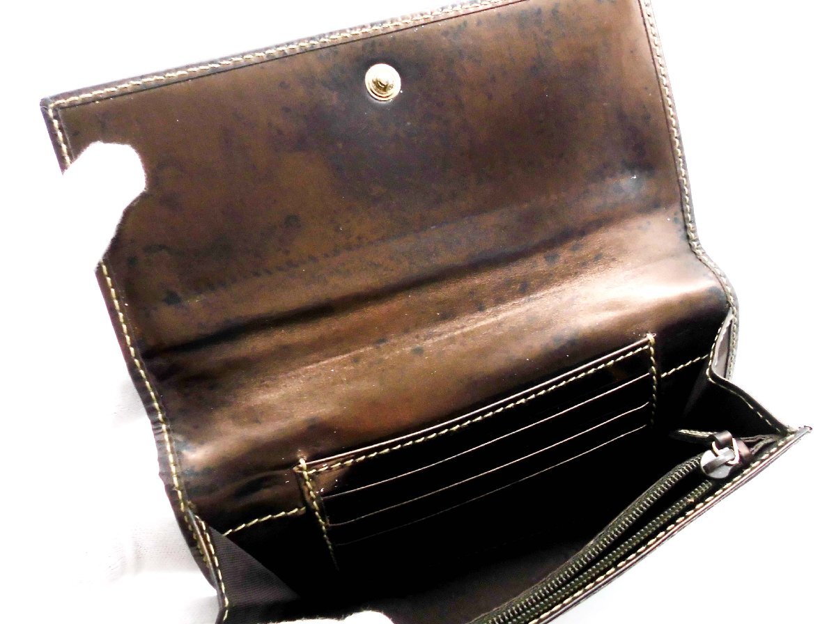 ≪商品詳細≫ 一般的な使用感を感じる状態です。 正面ロゴ金具が欠品しています。(金具なし、留め糸跡あり) 側面ふちの擦れ、ひび、糸のほつれあり。 内側エナメル部分に色落ち、変色あり。 その他ポケット内汚れ、細かな汚れの付着が見られます。