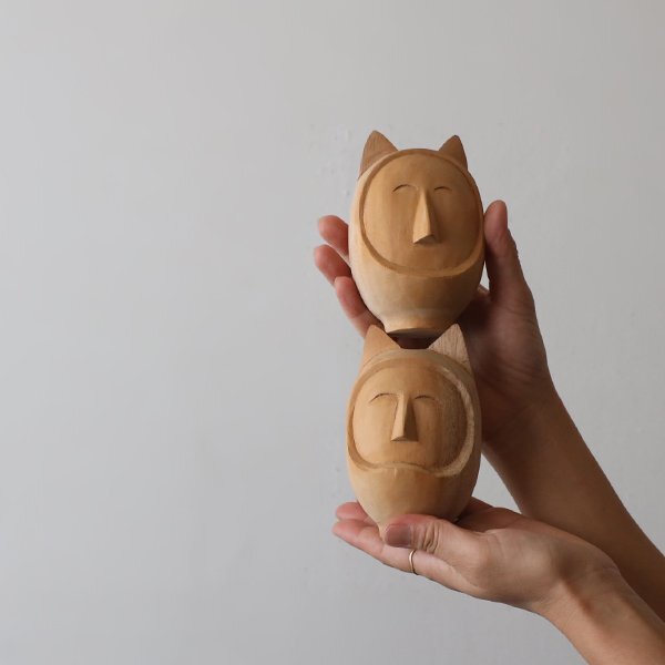 anvaiがオリジナルで制作した木彫りの猫だるま(無塗装仕上げ)