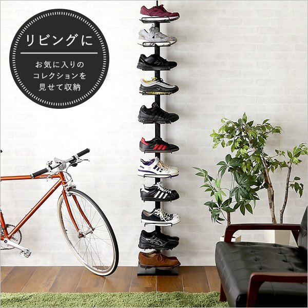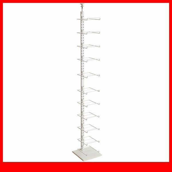 見せる収納の突っ張りシューズラック11段 お気に入りの靴を飾るディスプレイラックとしても、靴を収納するためのシューズラックとしてもお使いいただけます。 棚の高さ調節が可能なので、ハイカットやロングブーツでも容易に収納ができて便利です。 |