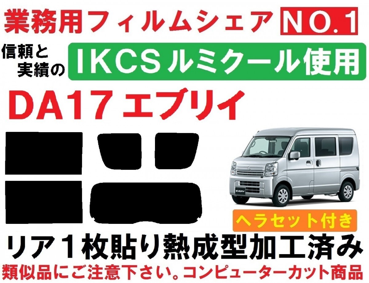 DA17エブリイ バン・ワゴン用『IKCSルミクール使用』リア1枚貼り成型加工済みフィルムリア5面セットです。(専用施工液付き) ・信頼の品質と実績で永い間業務用フィルムとして選ばれ続けているIKCS製品です。 ・業務用フィルムの中で最も信頼性の高い、ベストセラー商品です。 ・詳しくはIKCS株式会社HPをご覧ください。 ※『ルミクール』は当店でも 施工実績・販売実績NO.1の超人気商品です。 平成 27 年 3 月 ~ DA17V・DA17W、全グレードに対応出来ます。 バン・ワゴン 標準ルーフ・ハイルーフなどにより、ガラスの種類が複数有るため ご落札後お車の詳細を質問させて頂き、適合する商品をご用意させて頂きます。 ※令和6年マイナーチェンジ以降(6型~)にも適合致します。 ※適合等 ご不明な点など有りましたら、お気軽にご質問下さい。 ◇◆◇当商品には、画像2のヘラセットが付属します◇◆◇ ■滑りの良いシリコンタイプのゴムヘラ スムーズに水切り(清掃)・貼り付け後の水抜きが出来ます。 実際の業務でも色々な物を試しましたが、シンプルなこの形状・このメーカー・このグレードの物が1番使いやすいです。 柔軟性が有りガラス(フィルム)に密着するため、フィルム折れも防げます。 ■使いやすい厚みとコシの有るプラヘラ 形状は似ていても各メーカーにより硬さ・厚みなど色々と有ります。 慣れていない方でも扱い易いように少々柔らか目の物になります。 ヘラ先にはフッ素樹脂加工のクロスを貼って有りますので、滑りが良くキズを防止します。 ■ワイプオール(不織布ワイパー) 布同様の丈夫さと紙の持つ吸水性を発揮。糸くずの発生が無く均一素材のため異物混入の心配が有りません。 施工前のガラスクリーニング~施工時にフィルムが触れる可能性の有るガラスの周りのゴム部品の拭き取り清掃~吸水等に大変便利です。 全て実際の業務に使用している物で、その中から使いやすい物を選んでいます。 ヘラセットがご不用の場合、フィルムのみの商品も有ります。こちら ◇◆◇精密コンピューターカット◇◆◇ 貼りやすさを最優先に各部のサイズ・形状など微調整し、改良を重ねた独自のデータを製作。 高精度な最新・大型カッティングプロッターによるカットで正確で滑らかなカットラインを再現しています。 施工業者だからわかる、貼りやすいサイズ・形状に仕上げています。 ◇◆◇リア1枚貼り成型加工済み◇◆◇ リアガラスの湾曲に合わせて熱成型加工して有りますので、平面に貼るのと同様にたるみが出ず1枚貼り出来ます。 ※最適な状態に成型加工して有りますので、ヒートガン(ドライヤー)等は不要です。 ◇◆◇専用施工液付属◇◆◇ 軽視されがちな施工液ですが、貼りやすさに大きく関わる部分になります。中性洗剤などで代用せず、必ず付属の専用施工液をご使用下さい。 濃度については車種・季節などにより変わりますので、個別にお知らせ致します。 国内シェアNO.1の『IKCSルミクール』を使用しています。 ルミクールは経年退色が極めて少ない着色加工技術はもちろん、安定した冷暖房効率をアップする熱線遮断効果や断熱効果、内装を守り日焼けを防ぐため、全てのフィルムで99%の紫外線カットを実現しています。 ガラスの飛散防止効果で高い安全性を保ち、ハードコートタイプなのでキズにも強いカーフィルムです。 改良を重ねながら 信頼の品質と性能で、永い間業務用フィルムとして選ばれ続けています。 ■フィルムの種類■ 可視光線透過率 3% NS-003HC 可視光線透過率 7% NS-008HC 可視光線透過率13% NS-015HC 可視光線透過率20% NS-020HC 可視光線透過率30% NS-030HC 可視光線透過率46% NS-045HC ■全商品、キズに強いハードコート・紫外線(UV)99%カットです。 ※可視光線透過率が低くなるほどフィルムの色は濃くなります。 サイドとリアで濃さを替えたり等、可能です。 部分的にフィルムが必要になった場合、単品販売も承ります。 他にもDA17エブリイ用フィルム、各種出品中です。こちらもご覧ください。 下記のOEM車両にも適合します。 ・マツダ スクラム バン・ワゴン(DG17V・DG17W) ・日産NV100クリッパー・クリッパーリオ(DR17V・DR17W) ・三菱ミニキャブバン・タウンボックス(DS17V・DS17W) ご不明な点など有りましたら、お気軽にご質問下さい。 | ||