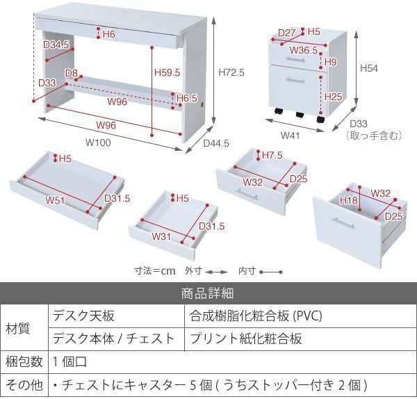 【カラー】 ダークブラウン、ナチュラル、ホワイト 【サイズ】 <外寸> デスク:幅100×奥行44.5×高さ72.5cm チェスト:幅41×奥行33×高さ54cm <内寸> デスク引き出し小:幅31×奥行31.5×高さ5cm デスク引き出し大:幅51×奥行31.5×高さ5cm 配線コードボックス:幅96×奥行8×深さ6.5cm チェスト天板:幅36.5×奥行27×高さ5cm チェスト引き出し小:幅32×奥行25×高さ7.5cm チェスト引き出し大:幅32×奥行25×高さ18cm 【材質】 デスク天板:合成樹脂化粧合板(PVC) デスク本体/チェスト:プリント紙化粧合板 【耐荷重】 デスク天板:(約)30kg以下 デスク引き出し:小(約)4kg以下 大(約)5kg以下 チェスト天板:(約)5kg以下 チェスト引き出し:小(約)5kg以下 大(約)7kg以下 【生産国】 インドネシア 【梱包】 サイズ:104×38×19cm、重量:31.5kg 【その他】 チェストにキャスター5個(うちストッパー付き2個) 【組み立て品】 お客様による組み立てが必要です。 |