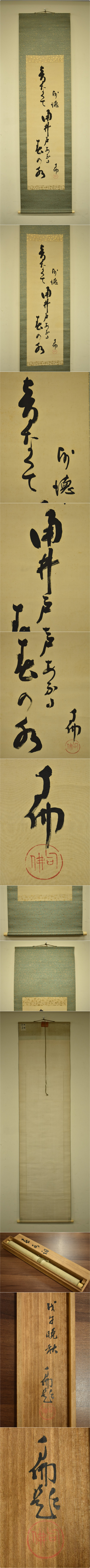 | ★商品説明・詳細など★ | ■真作 掛軸 大谷光演 句佛 書画 絹本 茶道具 煎茶道具 茶掛け 仏教美術 浄土真宗大谷派 東本願寺23世 *商品落札後のお支払期限は4日以内とさせていただきます。 4日を過ぎるとキャンセルとなり、自動的に【悪い】の 評価がつきますので御注意下さい。 ご理解の程、宜しくお願い致します。 ■現状品 ・全体に薄ヤケや薄汚れがあるほかに シワやヨレ等もみられます。 ・現状にご理解を頂ける方のみご入札をお願いいたします。 ・神経質な方はご入札をお控え下さい。 ■本紙 絹本 ■寸法 全体 縦197×横50cm 本紙 縦120.5×横36cm 軸先含む全長 約55.5cm (参考程度にお考え下さい。) ≪商品発送サイズ≫ ゆうパック 【 100サイズ 】 での商品発送です。 【発送元:石川県】 【配送料】はこちら→ ゆうパック送料(郵便局公式HP) 180サイズ以上30kg以上の配送は佐川急便のみの配送となります。 【配送料】はこちら→ 佐川急便 飛脚宅配便送料(佐川急便公式HP) ※ゆうパック及び佐川急便公式HPで送料を明記してある場合は送料に関するご質問はお答えできません。 ●画像に映っているものが商品及び付属品の全てです。他に付属品はございません。 ●オークション落札後の品の状態等の質問はお答えできません。必ず入札前に質問をお願いします。 ●商品説明と商品画像に相違がある場合は画像優先にてご判断ください。 ●商品の状態は説明欄、商品画像にてご確認くださいませ。 ●送料や配送方法、商品の状態をご確認の上お客様のご判断でご入札をお願いいたします。 ≪絵画の出品に関するルール改定≫当店も新ルールにしたがい絵画の出品方法を一部変更致しました。 ●(1)特定の作者の作品としている場合は、真作または模写と明記すること。 ●(2)特定の作者の真作としている場合は、万が一真作でない場合に返品を受ける旨を商品説明に明記すること。 ●(1)について、真作でないものは、最悪第三者による模写の可能性があるため、全て模写として出品いたします。 ●真作を出品する場合は、真作であることを明記し、万が一真作でない際には返品を受ける旨を商品説明に明記すること。(ノークレーム・ノーリターンの対象外商品です。) |