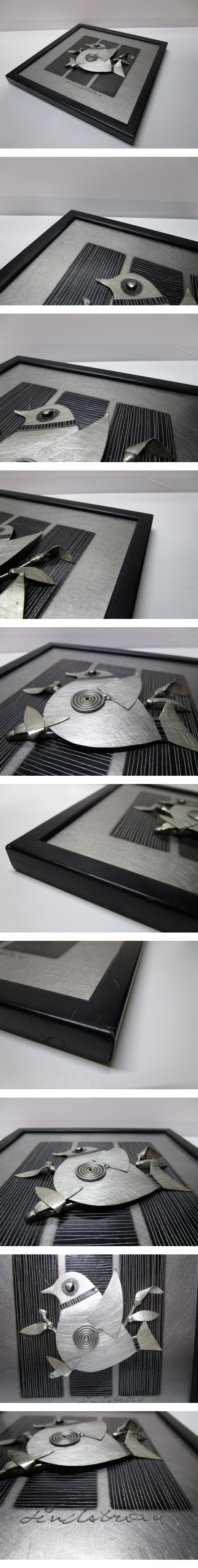 コルク板に貼り合わせたアルミ板に細かく刻んだ鋤き模様、その上に貼り合わせた細かなアルミパーツで表現されたかなりデフォルメをくわえられた鳥がミッドセンチュリー期の北欧デザインらしいモダンな中に親しみやすい表情をのぞかせています。重層的な構成なので、作品に奥行きが感じられます。同時期に活躍した同じ北欧スウェーデンのS.リンドベリやリサラーソンの陶板作品に通じるほどよいコミカライズをくわえられた造形がユニークな1品です。