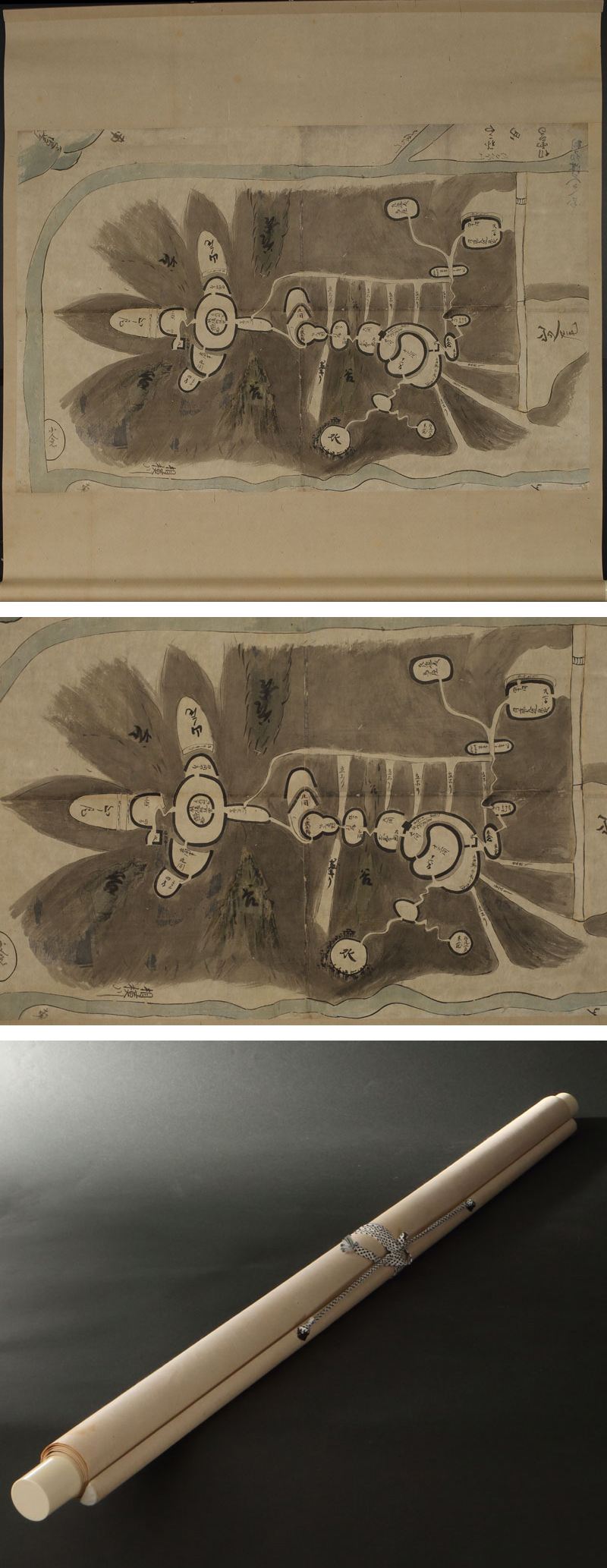 江戸後期の城絵図です。 甲斐と小田原を結ぶ要害の地にあった山城・津久井城の縄張図です。北条氏(後北条氏)にとっては対武田氏最前線の城郭であり、「三増峠の戦い」などで実際に武田方諸将による攻略が行われた、激戦地でもありました。 武田氏の奮戦を伝えるこれらの古城郭は廃城となってからも甲州流軍学の研究対象として学ばれ、理想的な城の縄張・設計に役立てられました。脈々と培われた学問的伝統が偲ばれる逸品です。 ◆津久井城 神奈川県相模原市(旧津久井町)にあった山城。鎌倉期に三浦氏一族の筑井為行が築城した城館がその起源といわれ、甲斐と小田原を結ぶ要所であったことから、戦国時代に北条氏が武田氏に対する前線拠点とした。北条氏家臣内藤景定をはじめ、津久井衆と呼ばれる家臣団を組織して甲斐の武田氏に備えたが、領内に小山田氏配下の郡内衆など武田勢も浸透し、「敵半地」と呼ばれる両勢力が入り組んだ地域となった。天正18(1590)年の小田原攻めで降伏・開城し、その後、廃城となった。城跡には現在、家老屋敷跡や宝ヶ池、堀切などが残っている。 寸法:高さ83cm、幅84cm(最大幅。若干の誤差はご了承下さい) 状態:経年のイタミがございます。 |