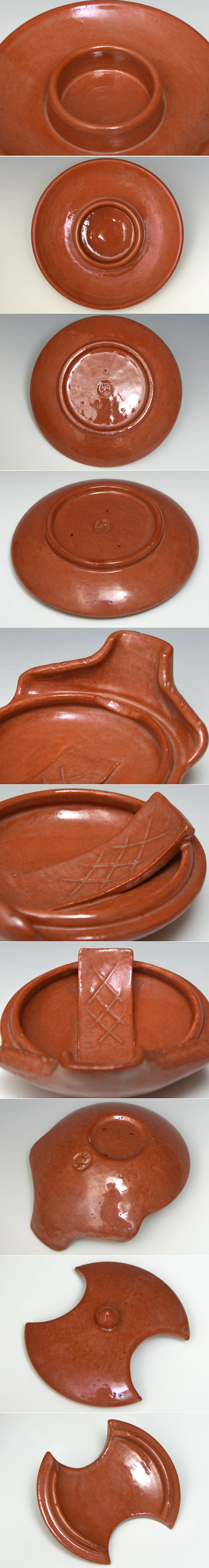 川崎和楽(造)赤楽 するめ瓦 です。 するめ土器は、全体に平たい形の楽焼の油盞で、舌付きで、縁が広くひろがった灯心受けと蓋に分かれています。 油盞を支える輪の付いた「下土器」という、底に油が回ることを防ぐ、楽焼の受け皿を下に置いて用います。 底部に「和楽」銘あり。 未使用品でワレカケ汚損なく状態は良好です。 ※撮影の際に生じた写り込みなどがございます。 ご理解の程よろしくお願い致します。 |