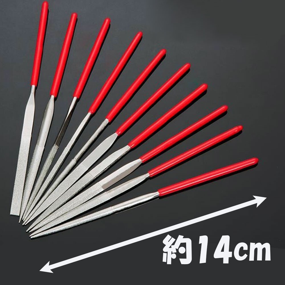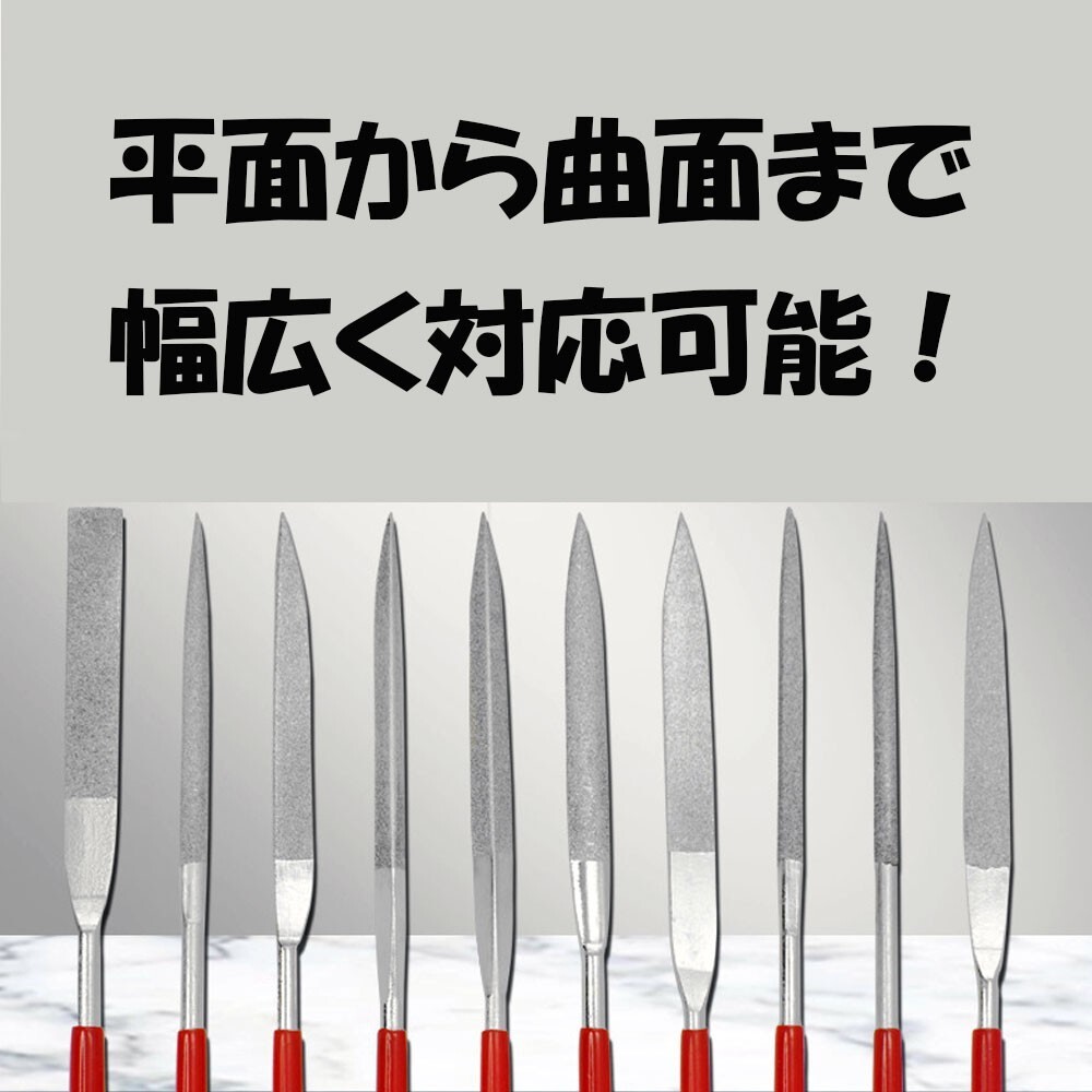 | 商品説明 | ダイヤモンドヤスリ10本セット 木工用 鉄工用 金属用 プラスチック用 セラミック用 ガラス用など あらゆる加工に対応できるシャープナー 何を揃えたらいいか分からない方 棒やすりセットをお探しの方 初心者の方にもオススメなDIY工具です 平・半丸・丸・三角・楕円形状で 手のひらサイズ 細かい作業に適しています 作業用途 研磨、研削 バリ取り ケバ取り サビ取り 面取り ハンドメイド DIY プラモデルに |