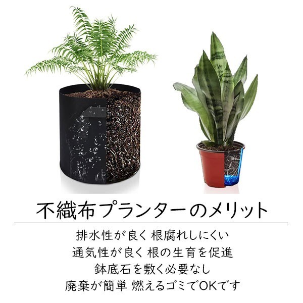 | 商品説明 | 10ガロンの大容量ポット 大型の不織布 プランター フェルトファブリック製の布鉢 軽量の深鉢タイプ 移動に便利な取っ手ハンドル付き 通気性と透水性が良く 植物の生育を促進する効果があります 直径:約40cm 深さ:約30cm