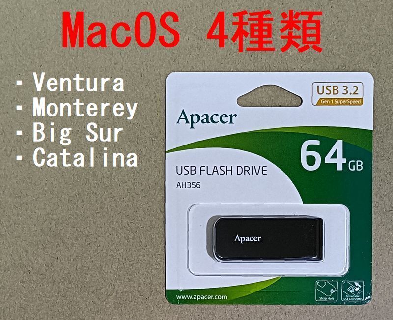 | MacOS 4種類 Ventura、Monterey、 Big Sur、Catalina、 インストール用 USB 64GB ●OS1:macOS Ventura 13.7.8 ●OS2:macOS Monterey 12.7.4 ●OS3:macOS Big Sur 11.7.10 ●OS4:macOS Catalina 10.15.7 ●USBメモリ 64GB (AP64GAH356B-1) メーカー:Apacer 製品名:AH356 ・インターフェースUSB 3.2 Gen1 ・端子形状:USB Type-A ・端子数:1 メーカーサイト!! ←クリック ※備 考 MacOS の、インストールを行うメディアです。 Startup Manager から起動すると、4つのOS選択画面が出ますので、 インストールを行なわれる、OSを選択してインストールを行なってください。 インストールや使い方、設定等のサポートは行ないませんのでご了承ください。 付属品はUSB元箱(パッケージ)だけです。 OSなので認識しない以外は、ノークレーム・ノーリターンでお願い致します。 返品等はできません。 USBメモリは新品ですが納品書の添付はありません。 輸送事故の補償はありませんが、クリックポストやレターパックプラスでの発送も可能です。 | |