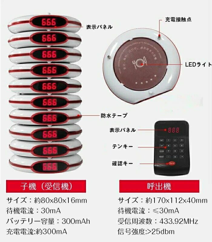 ワイヤレスページングシステム---ゲストの利便性のため、ゲストは注文後に空きスペースで休むことができ、バーで並んで待つ必要はありません レストランのイメージと雰囲気。作業効率が向上します。スタッフの混乱を避けます。キュー内の群衆を最小限に抑えます。レストラン、フードコート、ホテル、ストック、ビジネス、またはキューに多くの顧客がいる他の場所で広く使用されているゲストに、より速く電話をかける