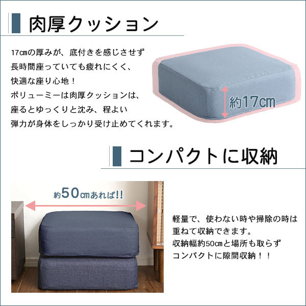 【カラー】 ベージュ、ブラック、ブルー、ブラウン、グリーン、グレー、ライトブルー、レッド 【サイズ】 W48xD48xH17cm/個 【重量】 1.5kg/個 【素材】 中材:ウレタンフォーム カバー:表地ポリエステル100% 裏地ポリエステル100% 【梱包】 サイズ:W44xD40xH48cm、重量:3.5kg 【その他】 日本製(カバーは中国製) 【完成品】 カバーはお客様取り付けです。 【ご注意】 ・サイズ、重量は概算です。 ・商品カラーはご使用のモニターによって実際の明るさや色と異なって見える場合がございます。 |