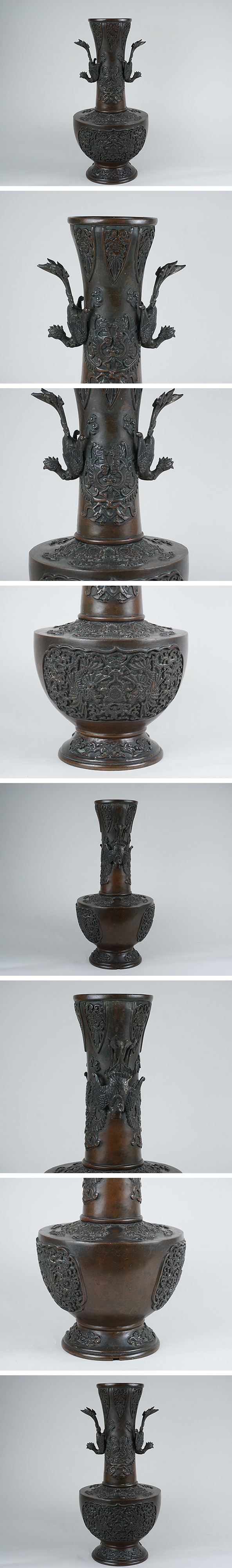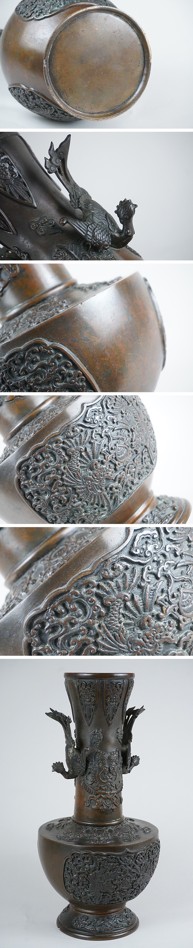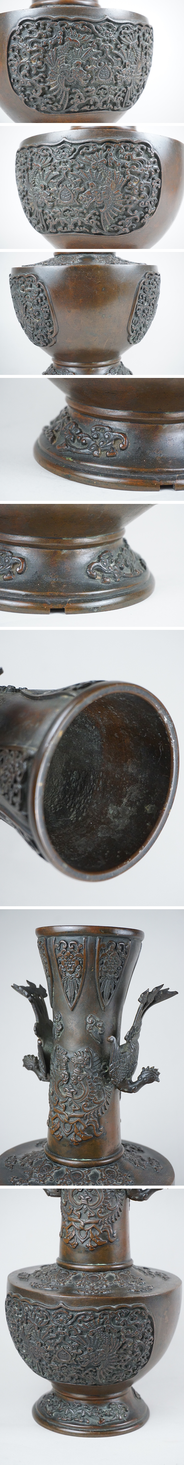 | 商品説明 | 時代造りの細密銅器花壷です。 少々使用感ありますが、大きな傷みありません。 鳳凰部は取り外しは出来ない仕様です。 美しい優品の銅器です。宜しくお願いします。 高さ34.0cm 口径9.0cm 胴径16.7cm 重さ3,247g | |