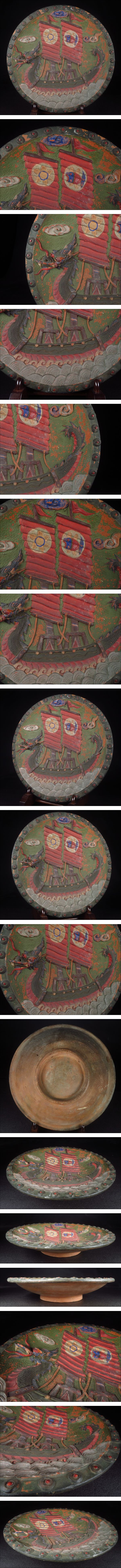 | 【SAKURAYA】細密立体彫刻の希少な作品【古琉球 古典焼 浮彫龍帆船図飾皿】時代物 飾鉢 陽刻 骨董品 古美術品 沖縄 壺屋 直径34cm② | ||