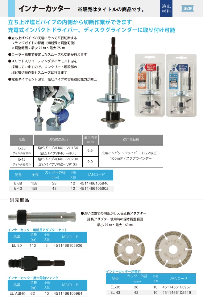 エホート EFFORTインナーカッター用替刃EL-43 エホート インナーカッター E-38、E-43用共通替刃■仕様・塩ビパイプ切断適応能力:VU40~VU200、VP50~VP125・切断可能肉厚:9.0mm・ダイヤ外径:φ43mm