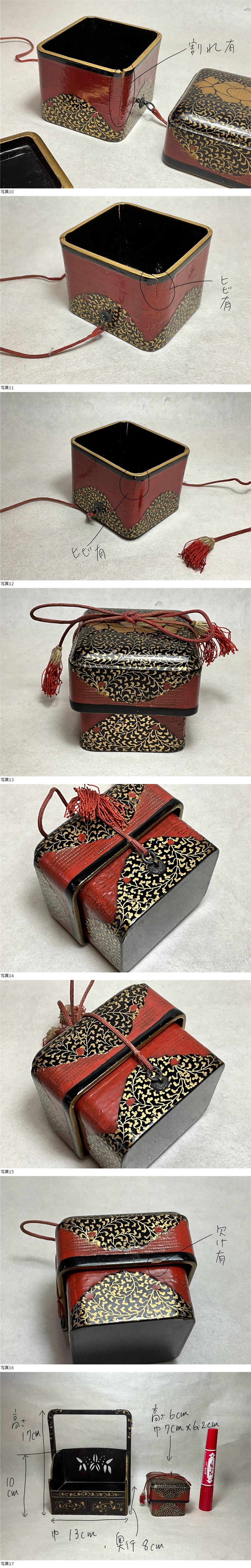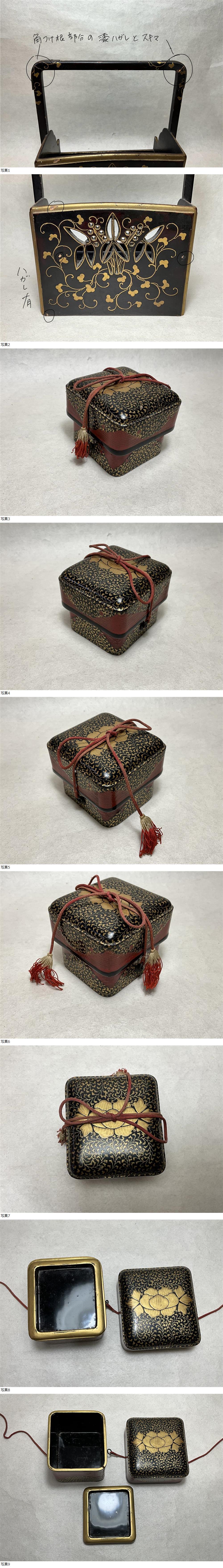 文箱本体の隅3箇所に割れやヒビがあります。割れやヒビ(画像を参考にして下さい)、ヤケ、汚れ、欠損、スレ、使用感など時代のダメージがあります。