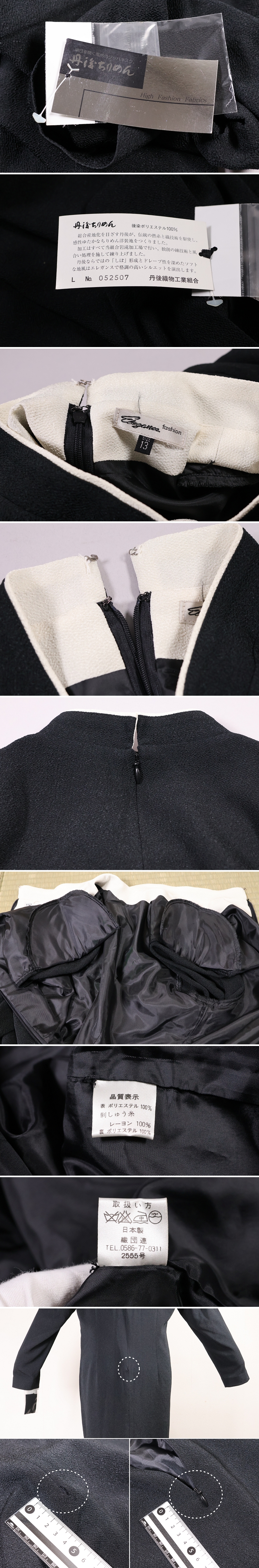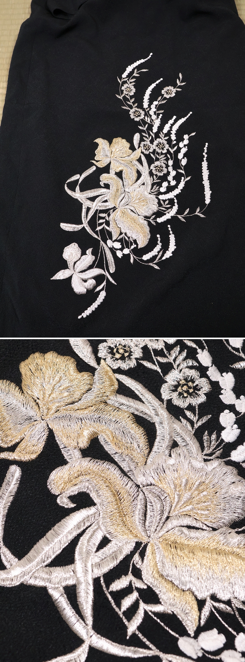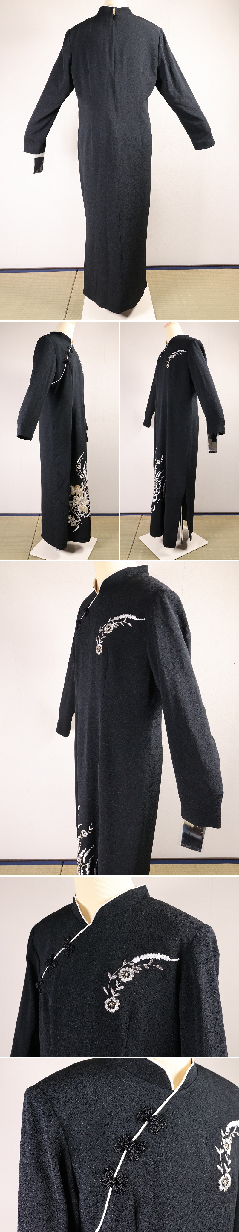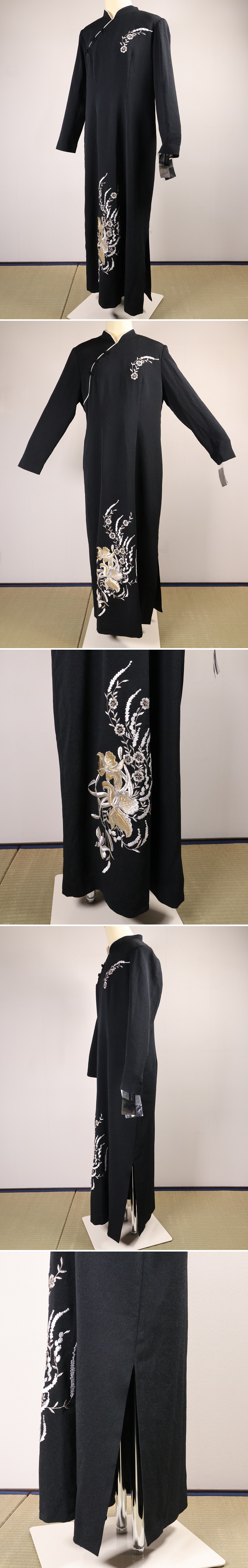 ◇丹後ちりめん 黒 チャイナドレス 洋装生地 サイズ13 L LL XL 大きめ ゆったり ブラック 草花刺繍 縮緬 日本製 長袖 ロング 丹後織物工業組合【CM465】◇