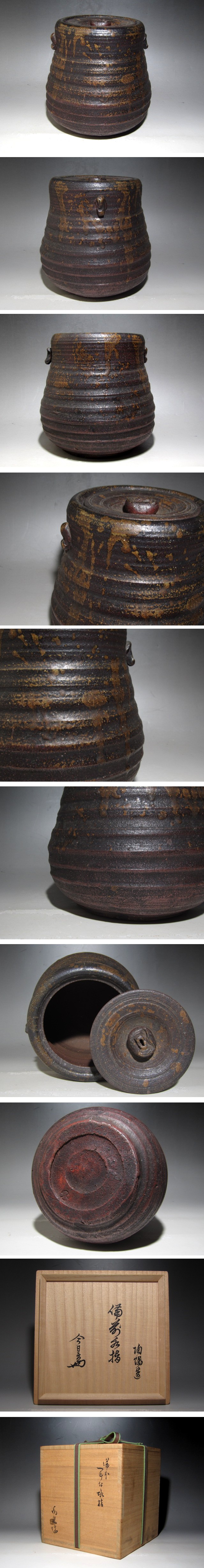 人間国宝金重陶陽作の備前水指です。 土の温もりを感じる味わい深い風格のある名品です。 箱蓋裏に裏千家十四世淡々斎の花押があります。 【金重陶陽(かねしげとうよう)1896-1967】 岡山県出身の陶芸家。備前焼の陶工として初めて人間国宝となった。 江戸中期以降人気を失っていた備前焼を再興させ「備前焼中興の祖」と称される。 陶陽は多彩な作風で近代備前焼の黄金時代を築き〈備前焼〉の重要無形文化財保持者(人間国宝)に認定される。 自らが優れた陶工であっただけでなく、多くの弟子を育て人間国宝を輩出するなど功績は計り知れない。 サイズ 直径18cm/高さ18.5cm(多少の誤差はお許しください) 状態 一見して疵やヒビ・直しは見られません。 骨董品という事をご勘案頂き、時代経過のスレや、小さな傷がある場合があるかもしれませんのでご承知置きください。 | |||