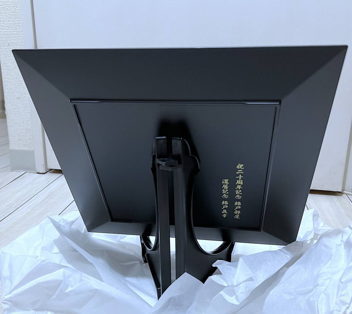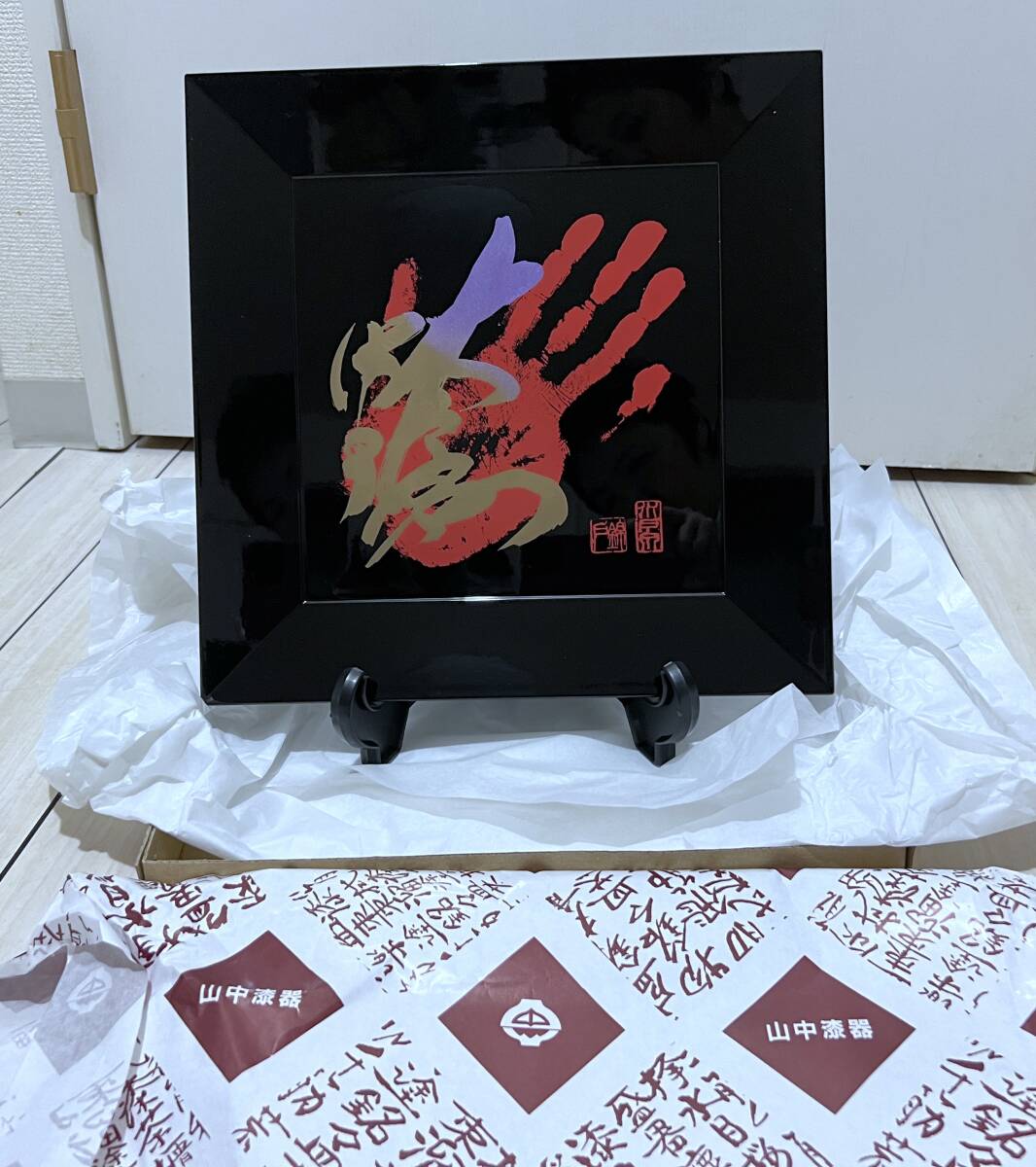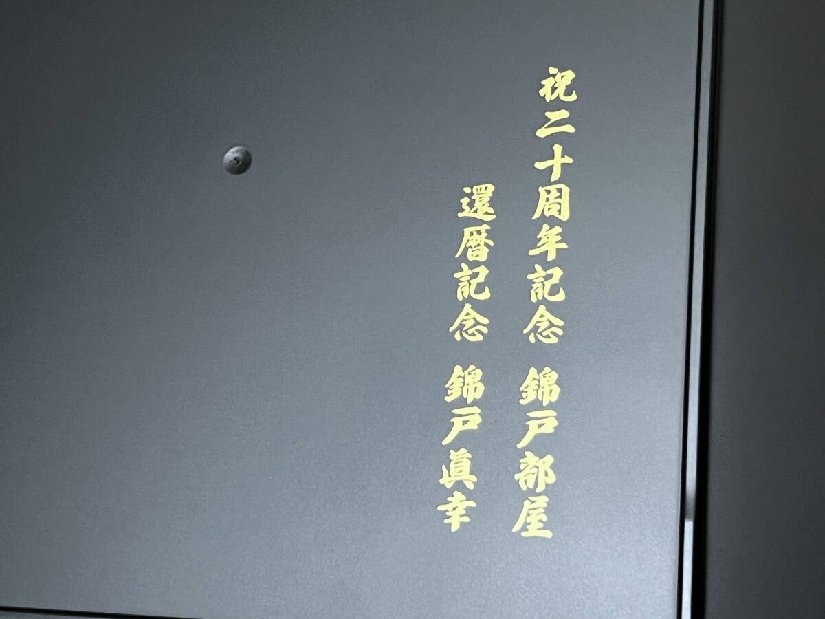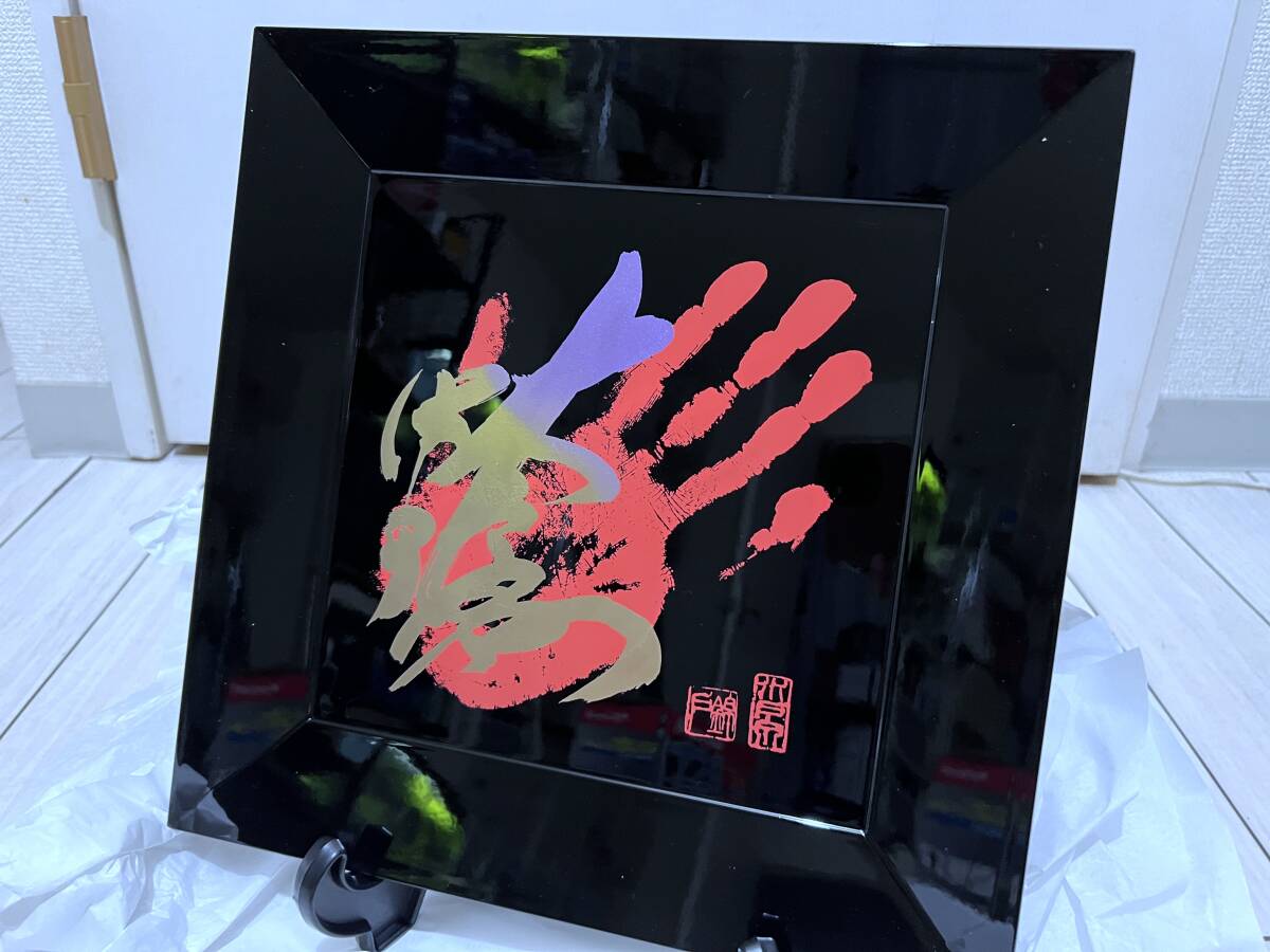 師匠の錦戸眞幸(元関脇 水戸泉)が務める錦戸部屋は日本相撲協会所属で高砂一門の相撲部屋です。20周年記念 飾り用絵皿 師匠の錦戸眞幸の還暦記念 手形入り四方皿(約32×32cm)【山中漆器】をいただきました。