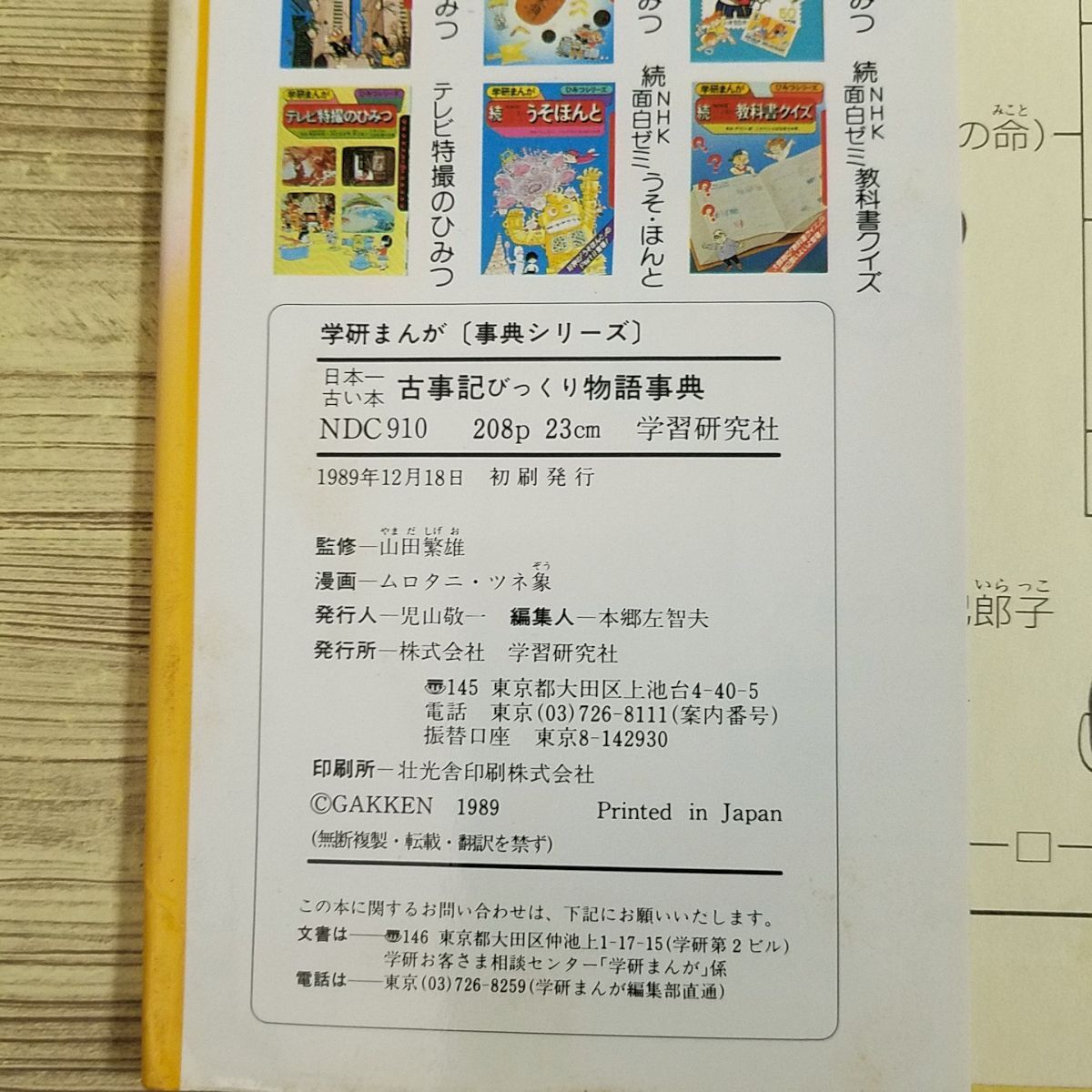 現存する日本最古の本「古事記」を、まんがでわかりやすく解説。 「古事記」の物語を読むと同時に、そこから知ることができる、古代の人々のものの考え方や、くらし方、習慣などについても知ることが出来る。 学研まんが事典シリーズ 【日本一古い本 古事記びっくり物語事典】 著者:ムロタニ ツネ象 出版社:学研 発行年:1989年12月18日 初刷 商品の状態:並下。使用感、経年変化、折れ、汚れ等がある。 (焼けあり / 折れ少々 / キズ・破れ少々 / 汚れ少々 / ヨレ少々 / カバー色あせあり) 付属品: 備考: カバーに色褪せやフチの傷みなどがあります。 経年によるページの変色があります。 #学習マンガ #学研まんが事典シリーズ #学研まんが #日本の歴史 日本史 #日本の神話 #社会科 当商品は中古品です。 状態については、写真もよく参考にしてください。 商品の状態についてできる限り確認・記載しておりますが、見落としがあった場合はなにとぞご容赦ください。 |