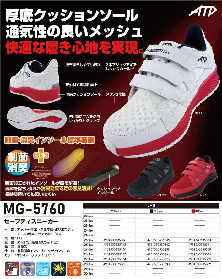 喜多 KITAMG5760※販売はタイトルの商品です。-----メガセーフティ TOP FORMシリーズ-----・つま先部鋼先芯ガード入りのセーフティシューズ・EVA厚底ミッドソールを採用し足をしっかりホールドする3本マジックベルト仕様・グリップ力を高めるため靴底全面にラバー(ゴム)を配置・アッパーデザインは、メッシュタイプの通気性を向上させる通期機構を搭載したカジュアルデザインの「デザインメッシュアッパー」・クッション性を向上させるため、インソールはクッションタイプを採用・インソールは厚底クッションに嫌な臭い菌を減らしてくれる「SEKオレンジマーク認証」の「制菌加工」インソールを標準搭載・かかと部に「ビーンバック」この掴みやすく引き上げやすい形状が脱ぎ履きしやすいポイント■仕様アッパー材質:合成皮革・ポリエステルソール材質:EVA樹脂・ゴム底靴幅:EEE重量:約420g(規格26.0cm片足)先芯:鋼先芯■JANコード25.0cm:493153053523525.5cm:493153053524226.0cm:493153053525926.5cm:493153053526627.0cm:493153053527328.0cm:4931530535280