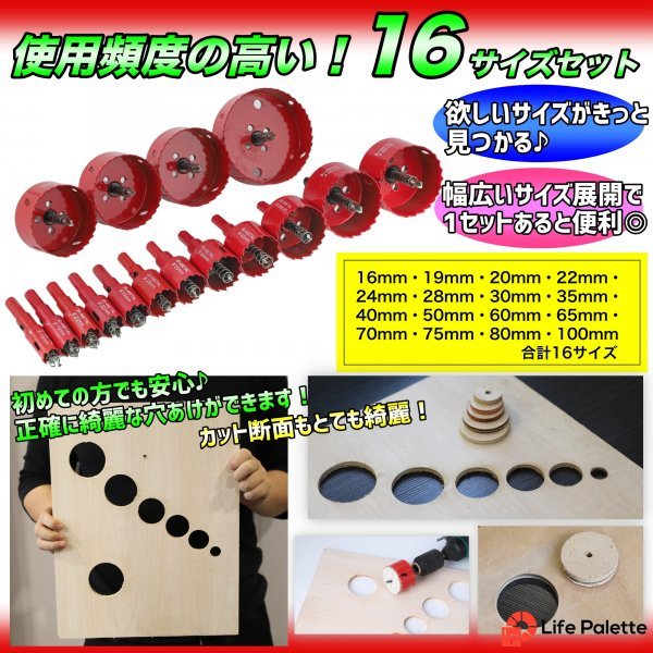 | ライフパレット製品 バイメタルホールソー ホルソー セット 工具 穴あけ セット ドリル 穴あけ ビット ステンレス 金属 用 木工 切削 掘削 加工 DIY 16~100mm DJ5616 新品 送料 全国一律1500円 バイメタルホールソー アルミ板、鉄板、木材、プラスチック、石膏ボードなどの穴あけに 使用頻度の高いものを厳選! お得なバイメタルホールソー16点セットです。 アルミ板、鉄板、木材、プラスチック、石膏ボードなどの穴あけにお使いいただけます。 センタードリル、スプリング付きで掘削などにも適しています。 薄刃設計により切削抵抗が少なく、速い穴あけが可能です。 セット内容【バイメタルホールソー 16本】 ヘッド直径16~100mm 16本セット 16mm 19mm 20mm 22mm 24mm 28mm 30mm 35mm 40mm 50mm 60mm 65mm 70mm 75mm 80mm 100mm 材質:HSS センタードリル スプリング付き 軸形:写真参照 (3本爪チャック式用 6.35ミリ六角軸には使用不可) 適用機器:回転専用ドリル、ボール盤 電動ドリル等 (チャック10mm~13mm汎用型) 適用材質:アルミ板(3mm以下)、鉄板(3mm以下)、木材、プラスチック、石膏ボード等 【ホールソー使用動画】 ホールソーセット続々出品中♪ 【使用上の注意】 部材に対し垂直に使用してください。途中からドリルを傾けたりしないで下さい。 作業時はゴーグルやマスク等の保護具を装着してください。 作業時はホールソー本体が熱を持っており、火傷の恐れがありますので素手で触らないようにしてください。 | |||