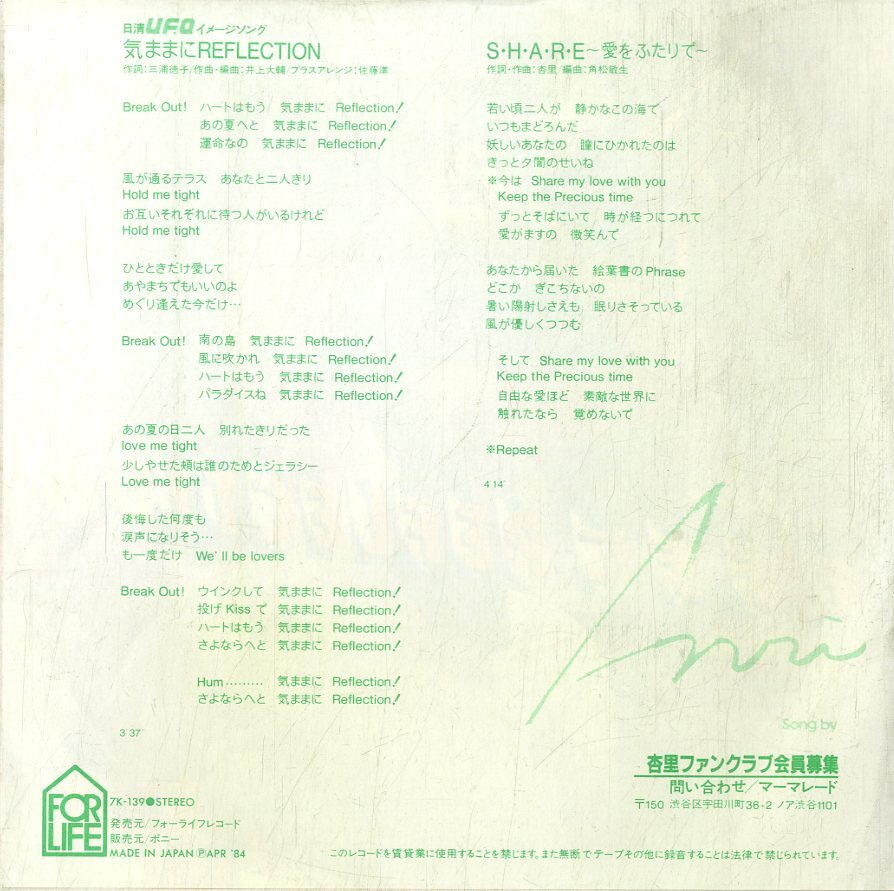 C00179130/EP/杏里「気ままにREFLECTION / S.H.A.R.E~愛をふたりで~(1984年・B面角松敏生編曲)」