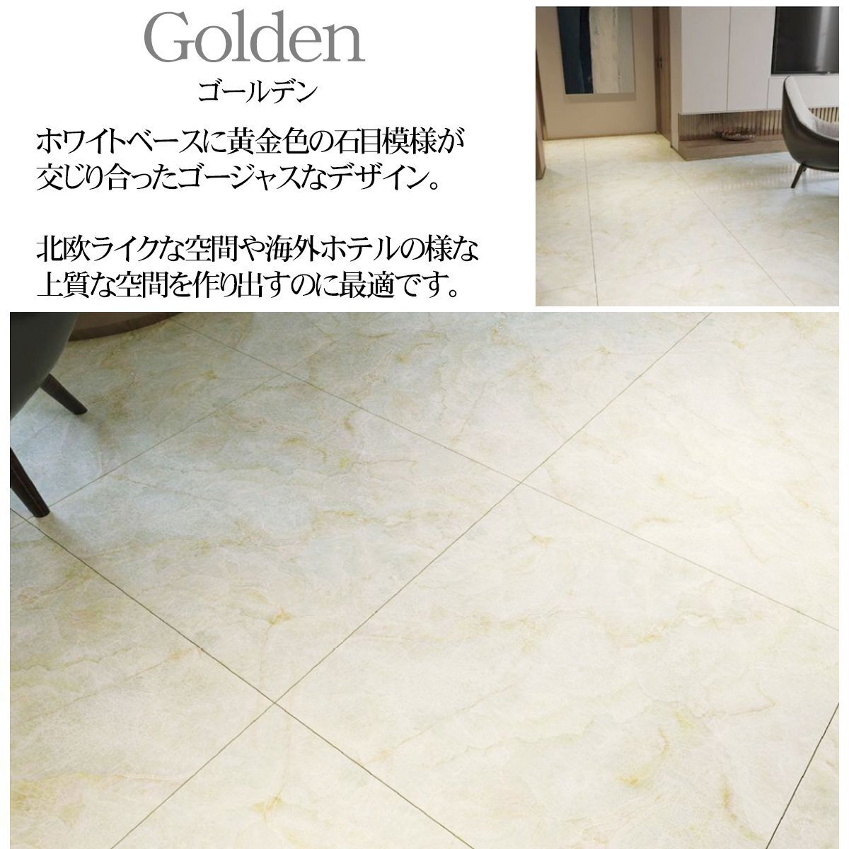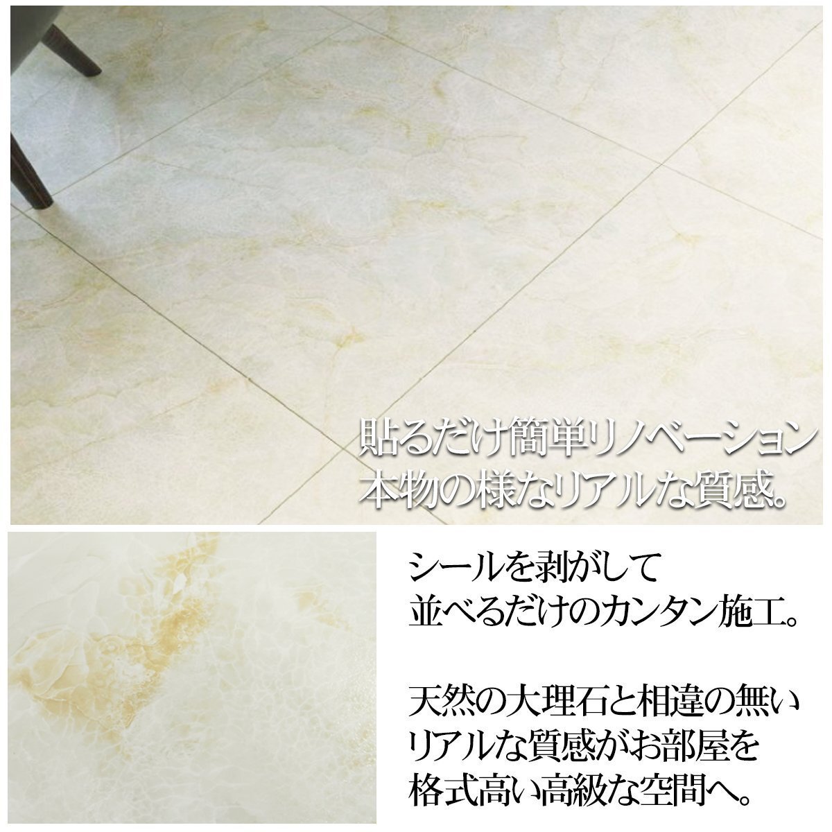 自分で出来る、簡単リノベーション! 貼るだけカンタン!のシール式フロアタイルシートです。 床の色やデザインが違うだけで雰囲気はガラリと変わります。 汚れの付きやすいキッチンや洗面所、 経年劣化などによるフローリングのキズや変色が気になる・・・ そういったお悩みを解決できるのがこの「フロアタイル」です。 毎日過ごすお部屋の床を低コストでリフォーム・模様替え出来ます♪ ■まるで本物の様なリアルな質感&デザイン! 細かい凹凸や模様の具合など、素材感にこだわって作られており、 リアルな質感なので安っぽさも感じさせず、手軽に高級感を演出。 ■裏面は粘着性があるので、接着剤なしで施工可能。 シートをはがして貼るだけ! ■カッターで簡単にカット! お部屋の形に合わせてカッターやハサミで簡単に加工できるので、 DIY初心者や女性でも簡単に施工できます。 ■圧倒的低コスト! フローリングの修繕やリフォームには膨大な費用かかってしまいます。 ですがこちらの貼るだけタイプのフロアタイルなら 「低コスト」でお部屋の雰囲気を変えられます! ※画像一枚目の丸窓部分に映しているのが 実物の商品の写真、色味になりますのでご参考ください。 ・1枚あたりのサイズ(約):高さ300mm×幅300m 厚み:2mm ・材質:PVC |