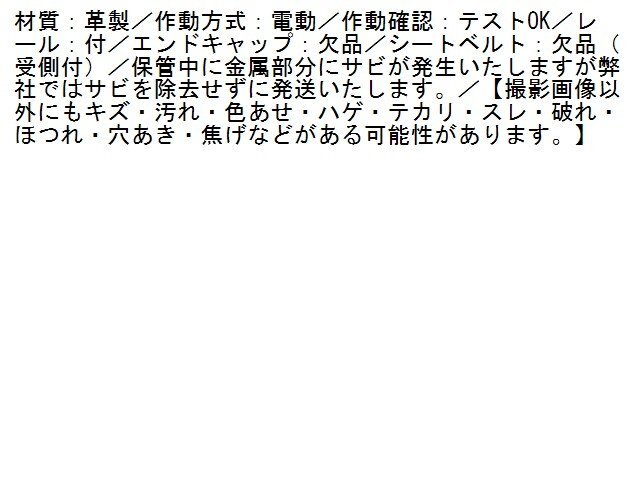 | 商品情報 | 材質:革製/作動方式:電動/作動確認:テストOK/レール:付/エンドキャップ:欠品/シートベルト:欠品(受側付)/保管中に金属部分にサビが発生いたしますが弊社ではサビを除去せずに発送いたします。/【撮影画像以外にもキズ・汚れ・色あせ・ハゲ・テカリ・スレ・破れ・ほつれ・穴あき・焦げなどがある可能性があります。】 | ||
