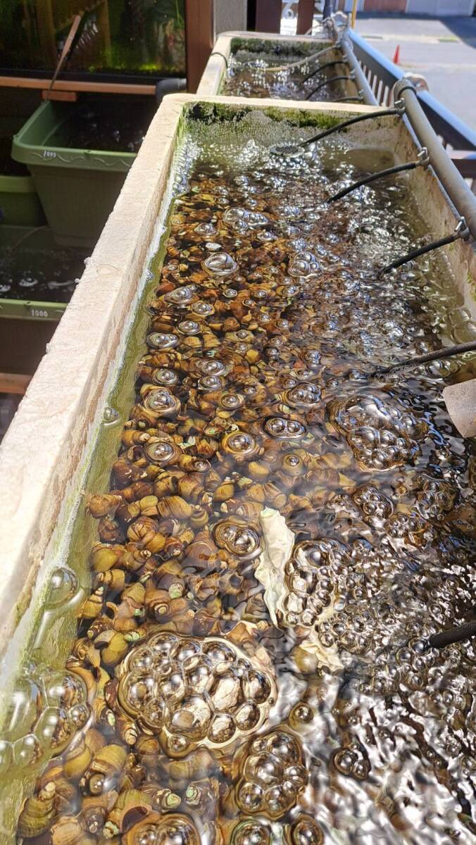 | 長く生きてる個体は貝頂が白色化したり苔が生えていい味が出ます。 | |