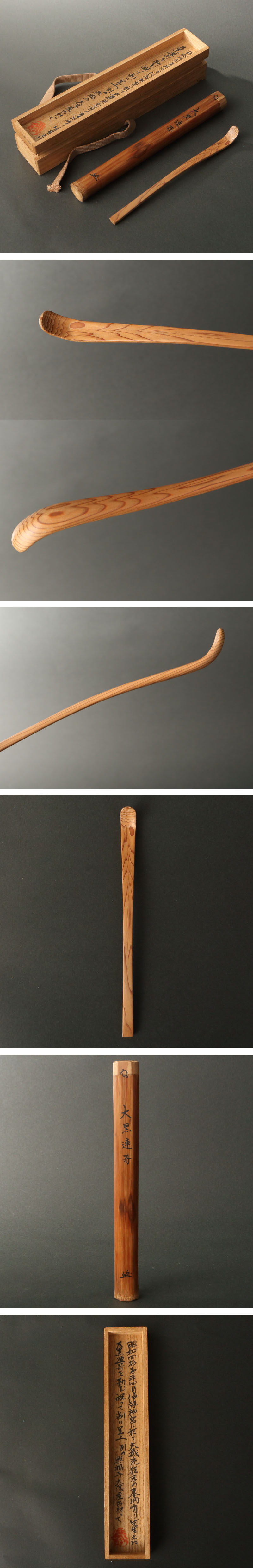 時代の古材茶杓です。 室町期創建の興福寺大湯屋の古材を用いた茶杓です。下削を務めた茶杓師某の識箱が付属し、昭和41(1966)年4月、大蔵流狂言の奉納を行った「先生」に贈呈した旨が綴られております。同年の『瑞垣』によれば、大蔵弥太郎(のちの二十四世大蔵弥右衛門)と伊勢市竹風会が神楽祭で狂言を奉納をしたことがわかり、筒銘は大蔵弥右衛門によるものと推察されます。 漣(さざなみ)のような美しい木目の逸品です。 ◆二十四世大蔵弥右衛門 昭和~平成期の狂言師。人間国宝・善竹弥五郎の二男。6歳の時に「靭猿」の子猿役で初舞台を踏む。昭和16(1941)年大蔵家へ入籍、翌年大蔵流24代宗家を継ぎ、大蔵弥太郎を襲名。同21(1946)年東京へ転居。日本能楽会会員。平成元(1989)年から弥右衛門を名乗る。大蔵会を主宰。平成16(2004)年没、91歳。 ◆大黒連歌 狂言。各流。信者が大黒天を祝って連歌を詠むと大黒天が現われ、打出の小槌(こづち)や袋やさまざまの宝を与える。「天正狂言本」では「大こく」。 付属:識箱・大蔵弥右衛門の筒書が付属します。 寸法:長さ18cm(最大幅。若干の誤差はご了承下さい) 状態:経年感、櫂先に使用感がございます。 |