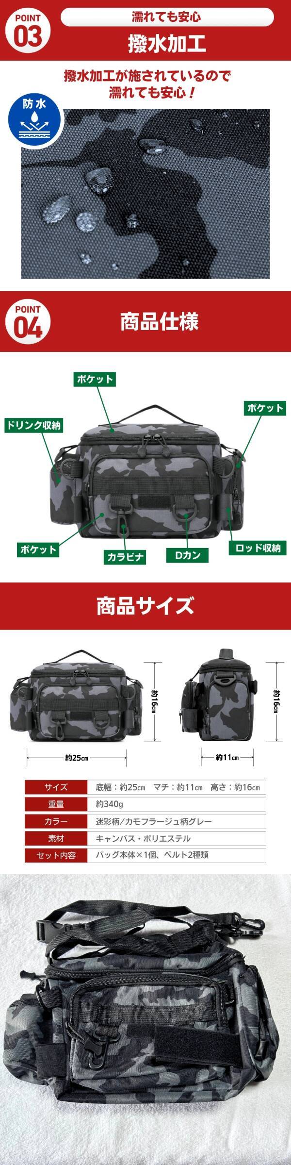 | 商品説明 | ご覧いただきありがとうございます! ●商品説明 【釣り好き必見!】身軽に動ける多機能ランガンバッグ登場! 移動の多い釣りにピッタリ! \コンパクトなのに驚きの収納力/ ◎3つのサブポケット付きで小物もスッキリ整理♪ ◎カラビナ&Dカン搭載でツールの取り付けもラクラク! ◎ショルダー&ウエストの2WAY仕様で使い方自由自在! ◎ロッドホルダー付きだから移動中も手ぶらで快適! ランガンやロックフィッシュなど、動き回る釣りシーンで大活躍! 必要な道具をコンパクトにまとめて、ストレスフリーに釣りを楽しめます♪ 初心者の方にもおすすめ! 道具が多くなりがちな方でも、きれいに収納できて持ち運びも簡単♪ これ1つで、釣りのスタイルがもっと自由に、もっと快適に。 ぜひ一度お試しください! ●商品詳細 【サイズ】底幅:約25㎝ マチ:約11㎝ 高さ:約16㎝ 重量: 【カラー】迷彩柄/カモフラージュ柄グレー 【素材】キャンバス・ポリエステル 【セット内容】バッグ本体×1個、ベルト2種類 ●お支払い方法 !かんたん決済 ●発送について 【ゆうパケットポストで発送します】 発送日 :お支払い後1~3日以内 到着目安:発送後2~4日程度 ※商品はポストに投函されます ※遠方の方はもう少しかかる場合もございます 【配送方法の変更はできません】 ●注意事項 ・落札後は期限内にお支払いください ・商品画像の転載や説明文のコピーはお止め下さい 〇初期不良は対応しますので、何かあれば「取引完了前に」ご連絡下さい |