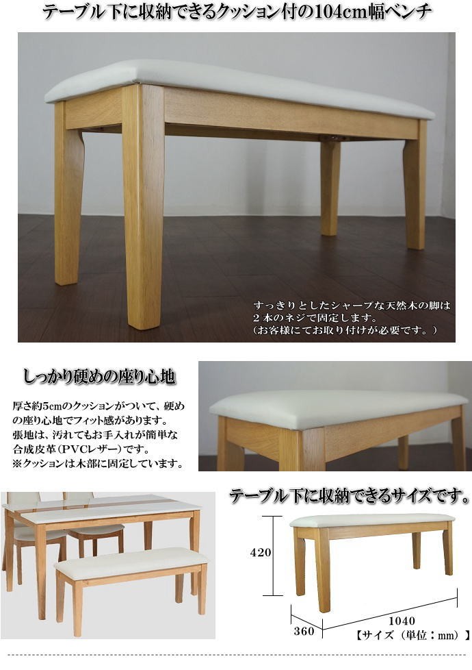 | 商品特徴 | ◇ナチュラル色木目&ホワイトの135cm幅テーブル+ハイバックチェアー2脚+104cm幅ベンチの4点セットです。 ◇やさしく明るいカラーコーディネイトでシンプルモダンなデザインです。 【テーブルについて】 ・ナチュラル色の木目の帯とホワイト色のハイグロス仕様の高級感ある天板です。 ・すっきりとしたシャープなラバーウッド無垢材を使用した天然木の脚です。 ・お客様にて脚のお取り付けが必要です。(脚1本につき2本のネジで固定します。) 【チェアーについて】 ・なめらかな曲線をもたせたハイバックのデザインで、体にフィットする座り心地です。 ・木製フレームの背もたれは、上部に隙間をつくり、すっきりとしたフォルムで引手としてもご利用できるデザインです。 ・張地には、お手入れが簡単な合成皮革(PVCレザー)を使用しています。 ・座面・背もたれともに厚手のウレタンをクッション材に使用し、硬めの座り心地でフィット感があります。 ・組立不要の完成品です。 【ベンチについて】 ・張地には、お手入れが簡単な合成皮革(PVCレザー)を使用しています。 ・座面に厚手のウレタンをクッション材に使用し、硬めの座り心地でフィット感があります。 ・お客様にて脚のお取り付けが必要です。(脚1本につき2本のネジで固定します。) | |