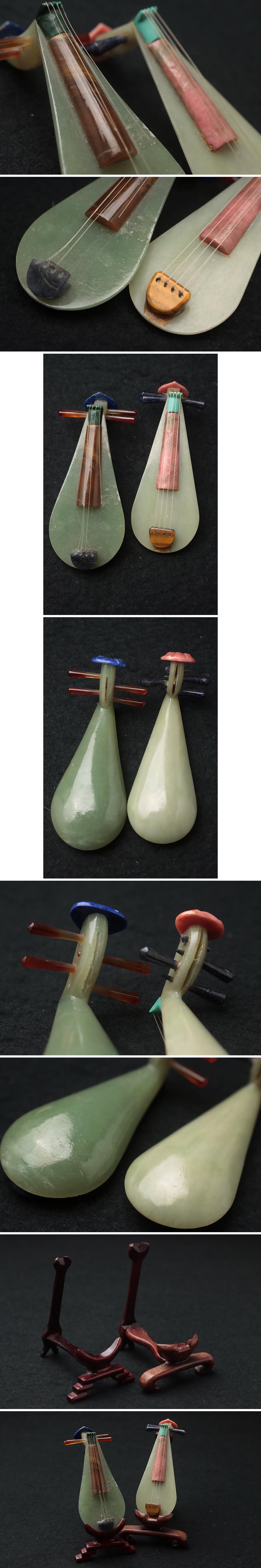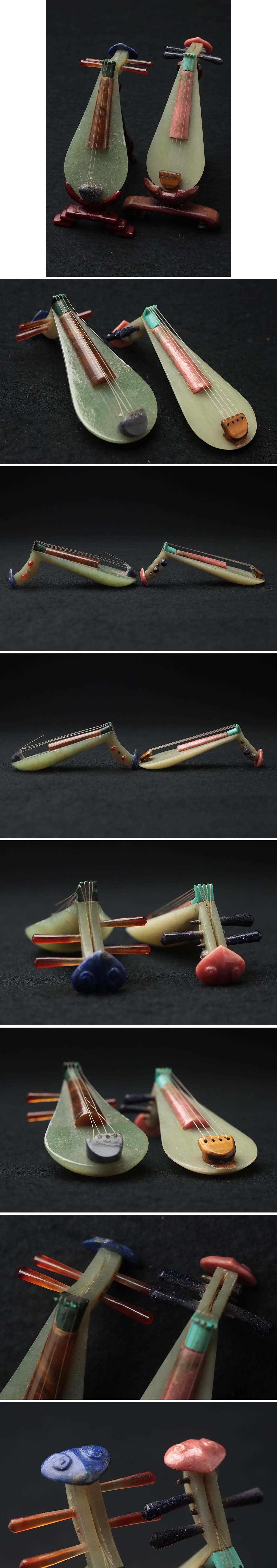 | ◆ 中国美術 玉石細工 ミニチュア 弦楽器「琵琶」台付 二点 虎目石/青玉他・砡楽器・玉楽器 工芸 中国砡器 古美術 ◆