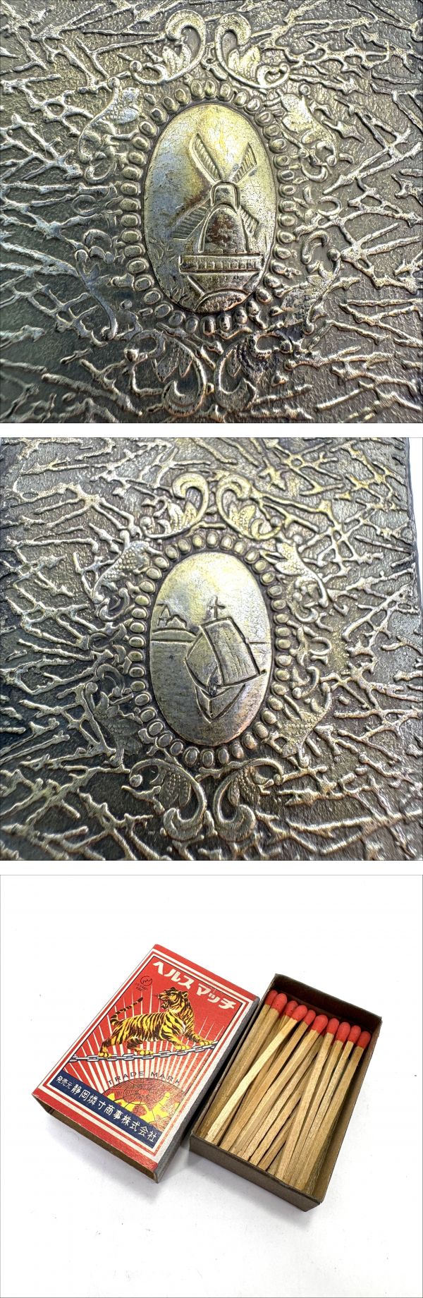 | 【輝屋】アンティーク 喫煙具セット 灰皿 シガレットケース ブロンズ調 船 風車 レリーフ 大正昭和レトロ 時代物 マッチ付 | ||