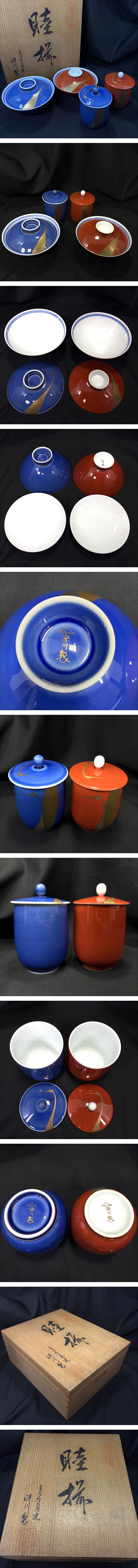 | 深川製磁 睦揃 夫婦 鶴 蓋付 茶碗 湯呑 瑠璃彩磁 金彩 宮内庁御用達 共箱 | ||