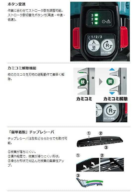 セット品をバラした商品です。付属品など商品内容は同じです。マキタ makita充電式ヘッジトリマ 両刃式MUH002GZ本体のみです。※バッテリー・充電器は別販売品です。88381743631■エンジン式23mLクラス■ハイパワーブラシレスモータ搭載高出力・高耐久・メンテナンスフリー。■偏角拝み刃形状鋭い切れ味の拝み刃形状。刃付け角度の鋭角化と、精密な刃先合わせ。■優れた導入性&枝が逃げにくい■防振構造採用ラバースリーブが振動を吸収。揺れが少ないので疲れにくい。騒音が気になる現場でも低騒音で安心。■高い防水性能防滴・防じん「ウェットガード」&防水保護等級「IPX4」により実現。■回転式ハンドル(5段階調整)左右45°・90°に回転可能。様々な刈込み場所で優れた操作性を実現。■ボタン変速作業に合わせてストローク数を調整可能。ストローク数切替えボタン付(高速・中速・低速)。■カミコミ解除機能■「簡単着脱」チップレシーバ■軽量ブレードスムーズな取回しを実現。■マグネシウムギヤハウジング採用軽量&高剛性
