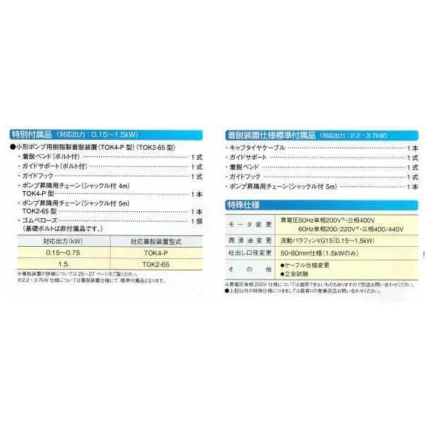 | 出力 kw 0.25 相・電圧V 三 200 全揚程m 4.0 吐出し量 0.14/0.13 m3/min 始動方式 じか入 重量(質量)kg 6.7 異物通貨径 35mm | キャブタイヤーケーブル 材質 VCT 真数×断面積4×1.25mm2 仕上外径 11.1 長さ 6m |