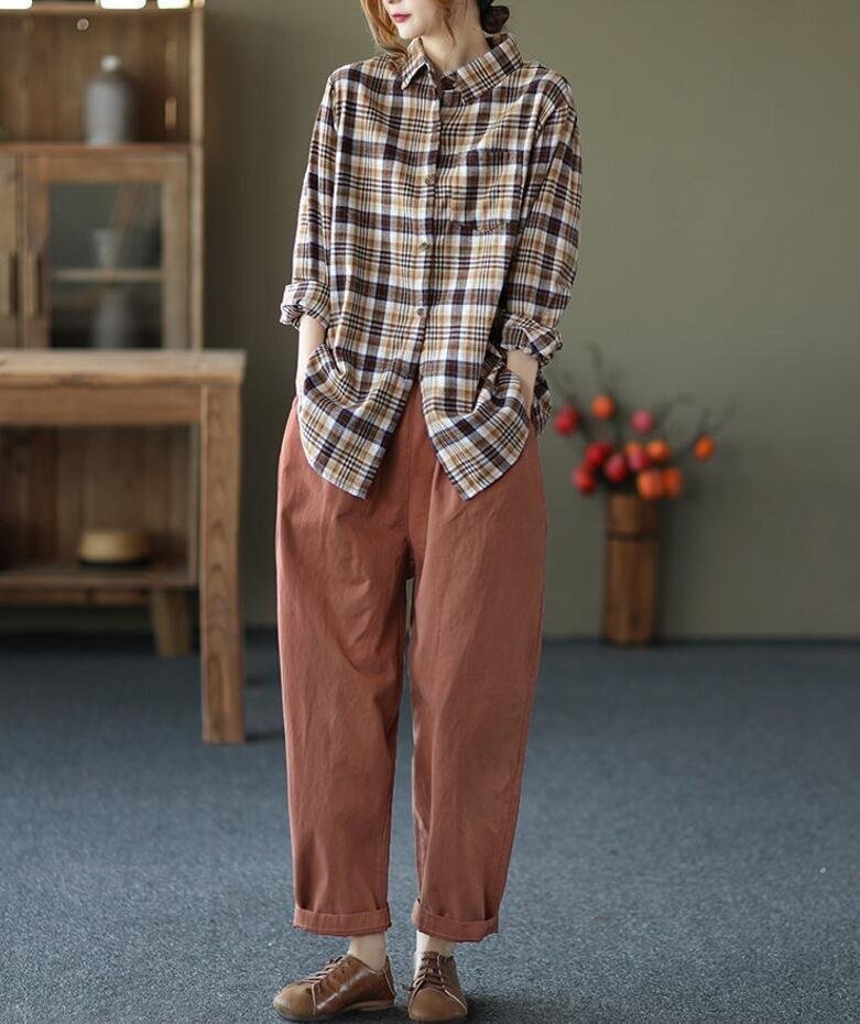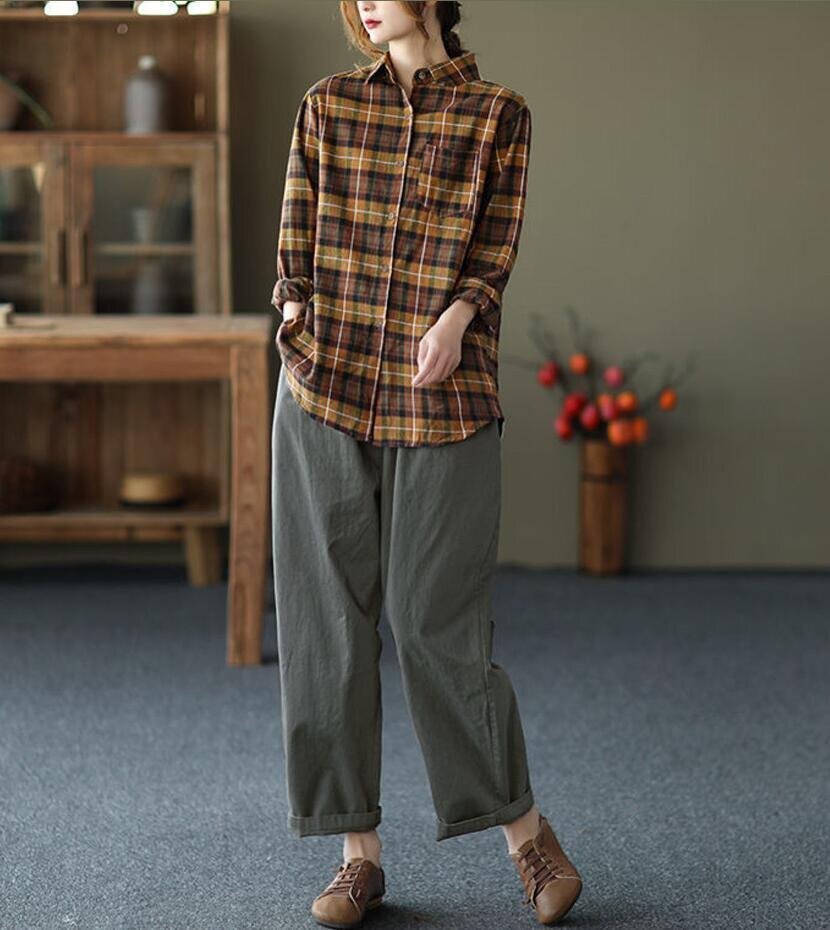 春新品 カジュアル トップス チェック柄 着痩せ 大きいサイズ チュニック 長袖 ブラウスシャツ★黄 /XLサイズ
