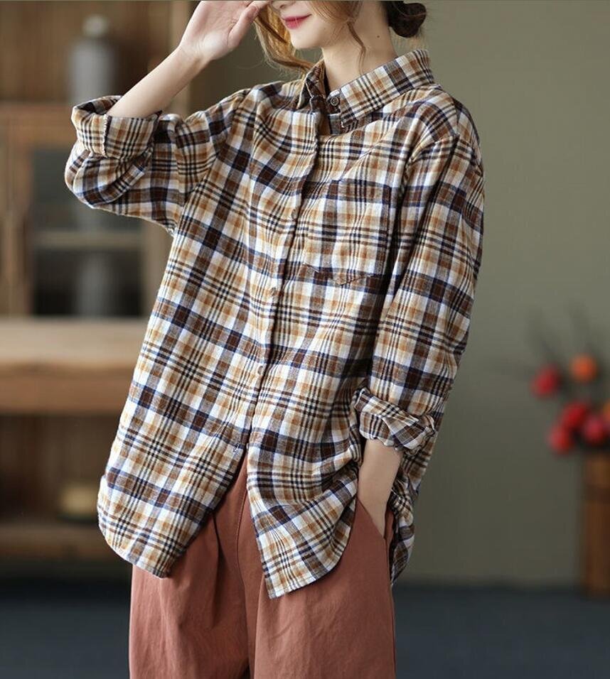 春新品 カジュアル トップス チェック柄 着痩せ 大きいサイズ チュニック 長袖 ブラウスシャツ★黄 /XLサイズ [浏览原始页面]