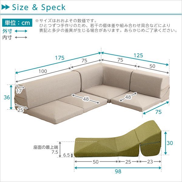 | 【カラー】 ベージュ、ブラック、ブラウン、ダリアングリーン、タスクグリーン グレー、ダリアンレッド、タスクレッド、ターコイズブルー 【サイズ】 外寸 1人掛け:幅50x奥行き75x高さ36cm(座面高:7.5cm) 2人掛け:幅100x奥行き75x高さ36cm(座面高:7.5cm) コーナー:幅75x奥行き75x高さ36cm(座面高:7.5cm) 【重量】 4kg~8kg 【素材】 ソファ中材:ウレタンフォーム(モールド成型) 表地:ポリエステル100% カバー:ポリエステル100% 【梱包】エコ梱包でお届けします。 サイズ:126x76x37cm、重量:15.5kg 【組み立て品】 お客様による組み立てが必要です。 【ご注意】 ・サイズ、重量は概算です。 ・商品カラーはご使用のモニターによって実際の明るさや色と異なって見える場合がございます。 |