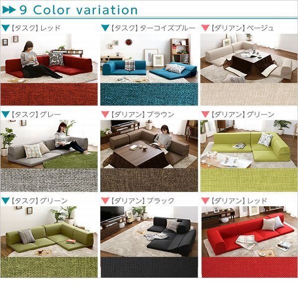| 【ポイント】 こたつやローテーブルにピッタリなコーナーローソファです。 3つのパーツを自由に組み替え可能で、パーツ毎を固定する接続パーツ付きです。 取り外して洗えるカーバーリングソファ! 1P、2Pの背もたれを倒せば、横になるのにちょうどいい角度に。 お部屋のアクセントにもなる、9カラーです。 |