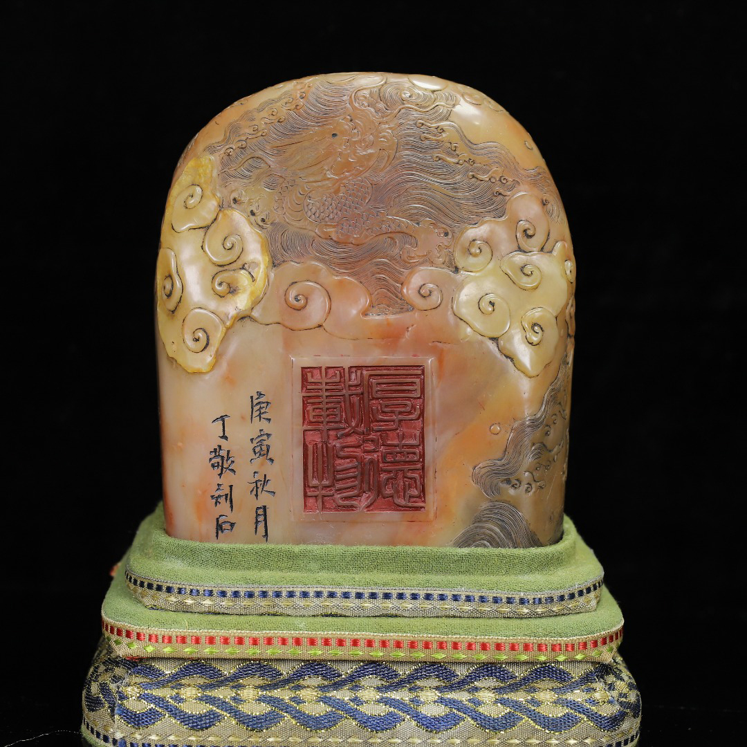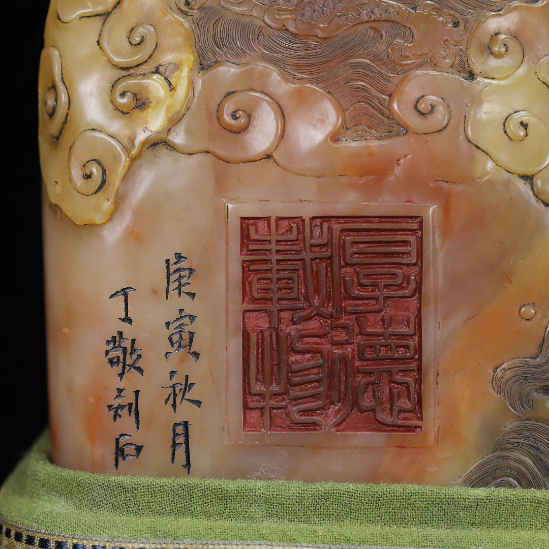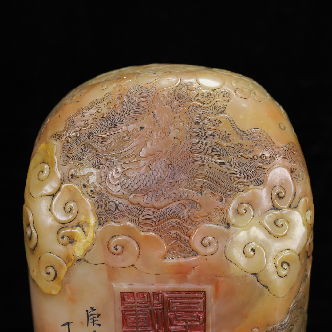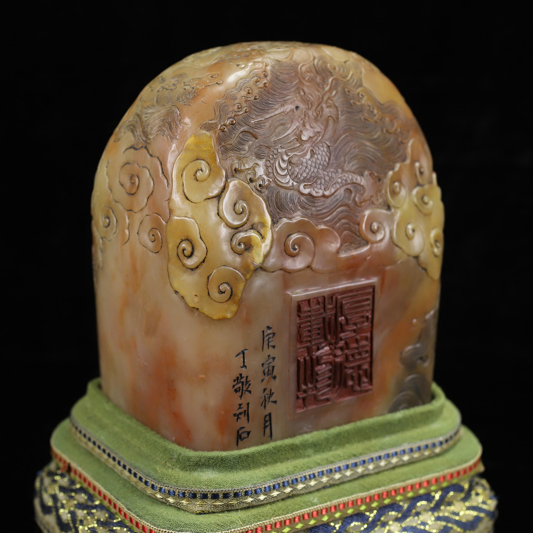 ◆御泓軒◆『清朝時代 寿山石 田黄凍石彫 盤龍紋閑章 印章 丁敬作 箱付』極細工・古賞物・中国古玩・中国古美術