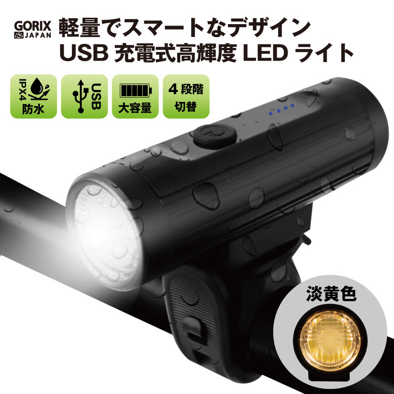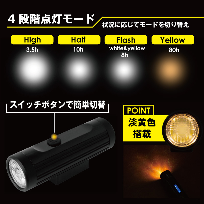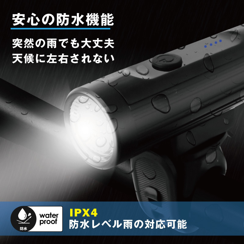 | 細身なスマートデザインの自転車ライト コンパクトな形状で自転車のビジュアルを邪魔しない ロードバイクやクロスバイク、マウンテンバイク、ママチャリなど様々な自転車に最適です。 ライト本体の取り外しが簡単なので取り外す事で盗難防止に。 また非常時の懐中電灯にもなります。 ・防水機能IPX4で急な雨や天候に左右されない ・USB充電式で気軽に使える ・電池残量が一目で分かるので充電タイミングを逃さない ・大容量電池2600mah ・超軽量アルミ合金でタフなボディ ・4パターン切替で状況に応じて選択できる ・珍しい淡黄光搭載 ・高輝度LEDで暗闇もしっかり明るい ・最大700ルーメン ・バンド式で簡単取付け 付属USBケーブル、ブラケット 材質アルミ合金ライト、ABSブラケット 本体サイズ長さ9.5cm 直径3cm 本体重量130g 対応ハンドルバー直径22.2-31.8mm 光度LumensMAX 700LM ライトタイプ高輝度LED (CREE XM L2) 防水機能IPX4 レベル バッテリ大容量2600mAh内蔵Li-ionバッテリ フル充電時間約 4-5時間 充電タイプUSB充電式(USBケーブル附属) 4段階切替モード (最大連続使用時間hr)強100% (3.5h)-通常30%(10h)―スロー白と黄色光点滅 (8h)- フォッグモード黄色光 (80h) 四段階電池残量指示機能100%(4点灯)-75%(3点灯)-50%(2点灯)-25%以下(1点灯) 《ご注意》・商品は入荷によりキズがある場合があります。 ・保証対象外になりますのでご了承お願い致します。 ・ディスプレイ環境により実物と色が異なる場合が有ります。 ・入荷時期により予告無く一部仕様変更する場合が有ります | |