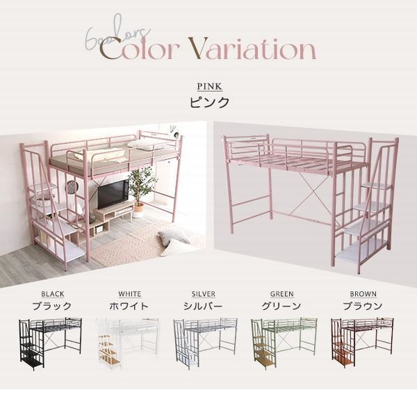 | 大人かわいいインテリア 階段付き パイプロフトベッド! 空間を有効活用できるロフトベッドでハイタイプ・ミドルタイプに高さ調整可能です。 階段は左右どちらでも設置OKで階段下には小物収納ができて便利です。 階段横と入口側にも手すりが付いているので、上り下りをしっかりサポートします。 耐荷重120kgの安心・安全設計です。 2口コンセント宮棚付きなので携帯、ライトを枕元に置くことができます。 衣類を掛けれるパイプハンガーと小物を引っかけられるスチールネットは収納として大活躍です。 サイドフレームは高さ27cmあるので布団のズレや寝返りをしても安心です。 |