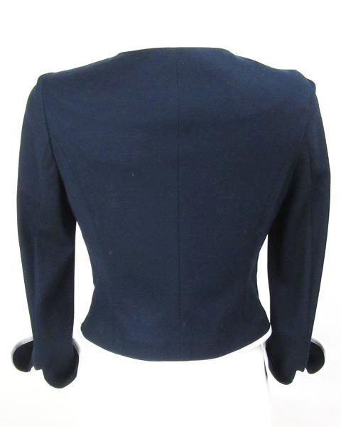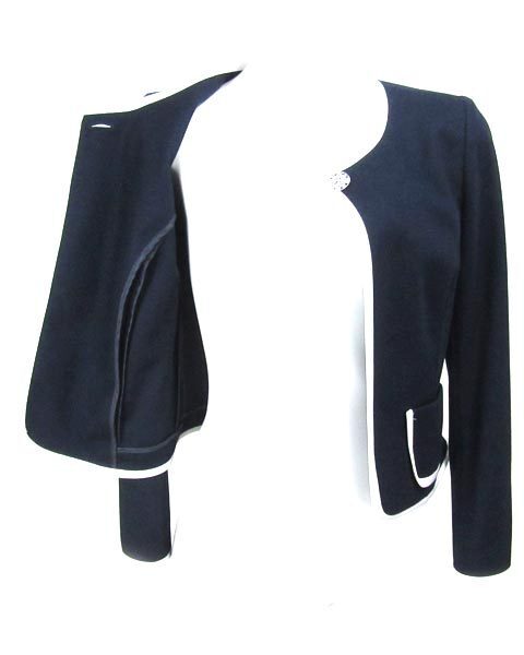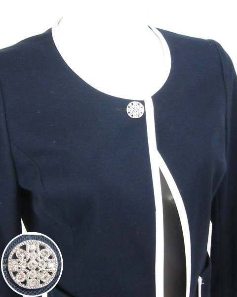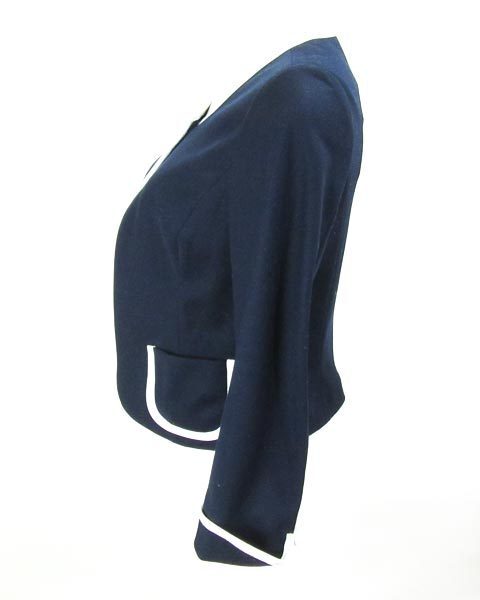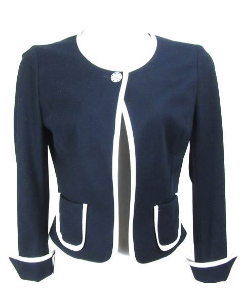 | 紺に白のパイピングが清楚で上品なジャケット。ストーンがついた華やかなボタンが1つついています。裏地がない春夏ラインのデザインで、ビジネスシーンやお子様の学校行事で活躍してくれます。シフォン素材からコットン素材、サマーツィードまであわせて頂けて幅広く活躍してくれます。 |