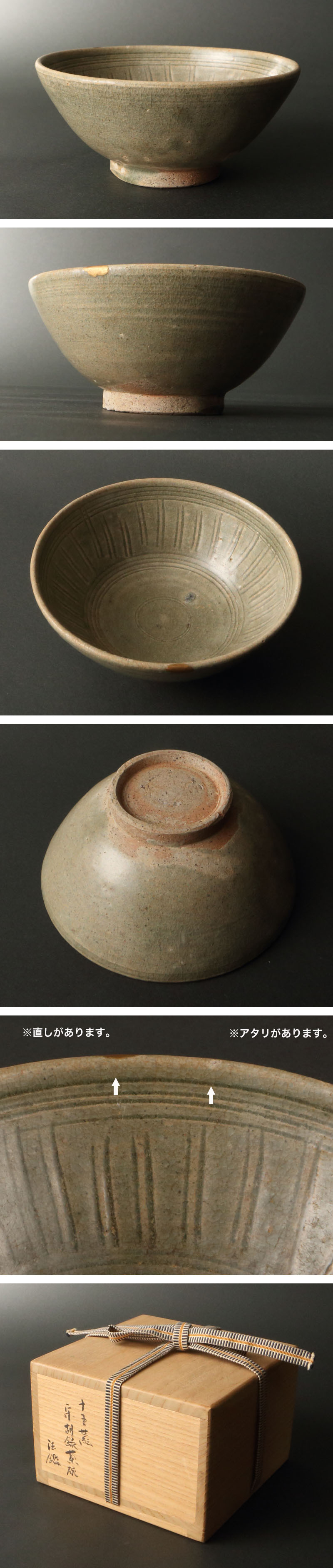 ・読み下しは参考程度に留め置き下さい。 ・水漏れの確認は、真水で1時間行っております。これ以上の水漏れにつきましては保証いたしかねますのでご了承下さい。 ・寸法は本体のみの実寸で計測しており、塗蓋・筒などの付属物は含めておりません。また掛軸は総丈・幅の実寸となり、本紙は計測しておりません。ご希望の方はお手数ですが質問欄にてお問合せください。 ・細かな山キズ、自然の貫入、釉薬の縮み、石ハゼなどは、個人の見解に誤差が生じる場合がございます。明らかに人為的なキズ、直し以外は無傷としております。 ・付属品(箱、布、栞、極書、額縁など)の状態は特筆しない場合がございますのでご了承ください。 ・信楽や伊賀など焼き締めの水指や花入のみ、水漏れの有無を確認のうえ記載しております。 ・通常、発送時には資材を再利用してお包みしております。新品の資材をご希望の場合には、ご落札後に取引メッセージにてご連絡ください。 |