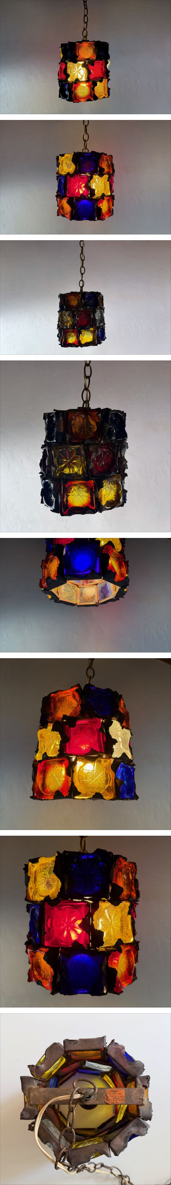 1970年代.メキシコ.FEDERS社.創業者でもあるFelipe Delfinger(フェリペ デルフィンガー)デザインによるペンダント照明。銅製のベースに5色(クリア.オレンジ.レッド.ブルー.イエロー)のガラスブロック,合計24個が埋め込まれています。E26.普通球.60W仕様(電球付属無.LED球使用可)。状態…金属部分に経年変化あり,画像にもありますようにガラス部分(下部クリアー)にチップ1箇所と割れあり(使用には問題ありません)..他,程度良好。本体寸法…20x20xH20cm。チェーン寸法…74cm。電源コードの長さ104cm。プルスイッチ付属。現状,コードの先端はプラグになっておりますが引掛シーリングキャップに交換が必要な場合は仰ってくださいませ。重量のある照明ですので設置する場所をご注意下さいませ。